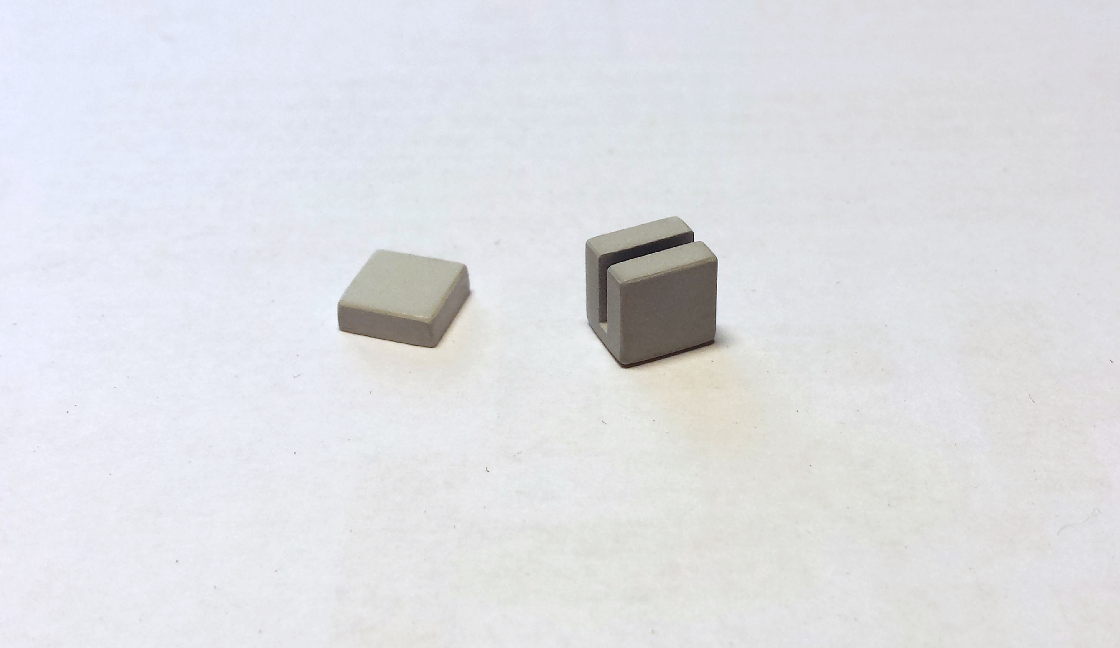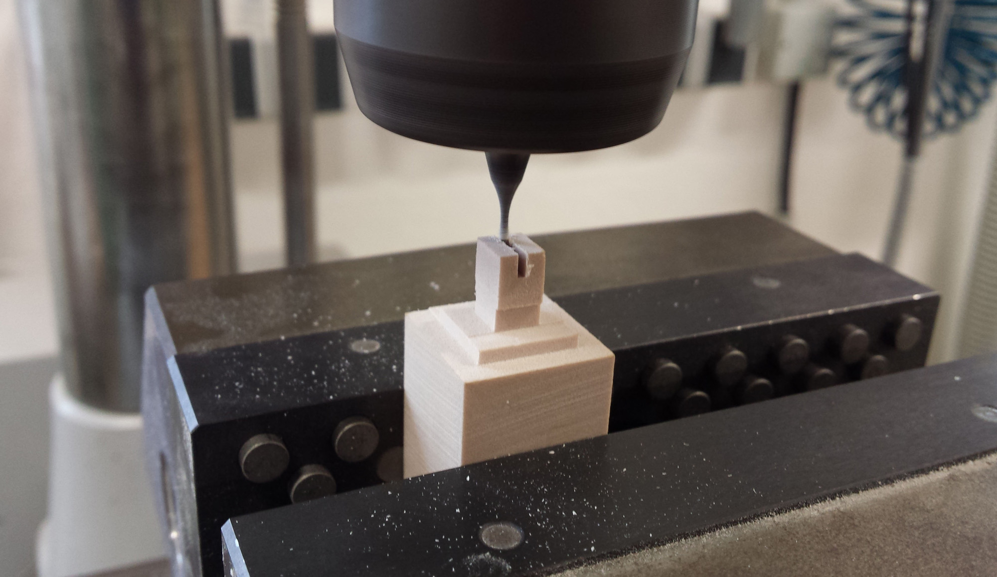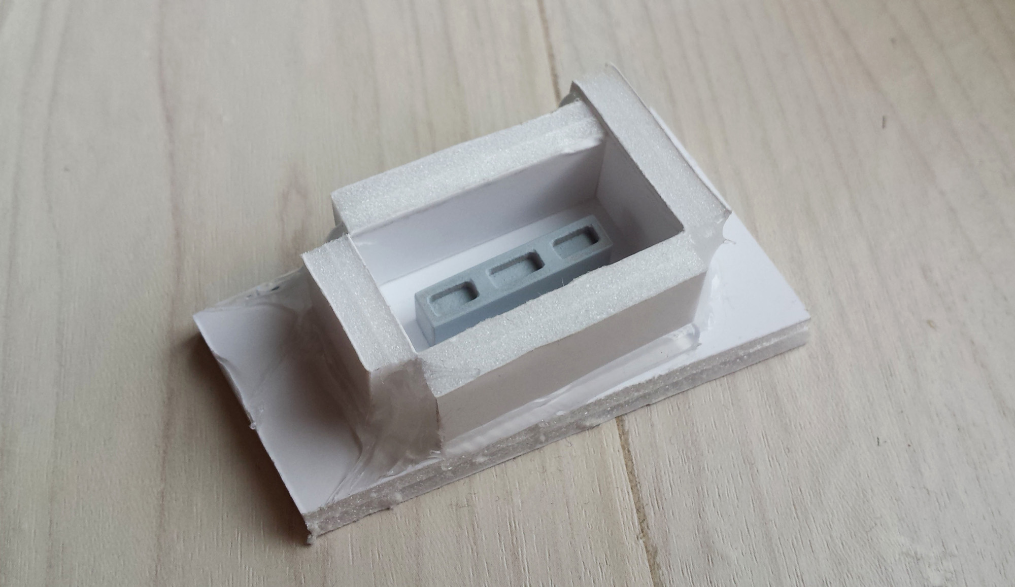 An einer Fräse fertige ich aus einem Polyurethanschaum (Ureol) ein Urmodell für die kleinen roten Würfel, die später auf der Platine sitzen. Anschließendes Grundieren und Schleifen bildet eine glatte Oberfläche für das Abgießen.
