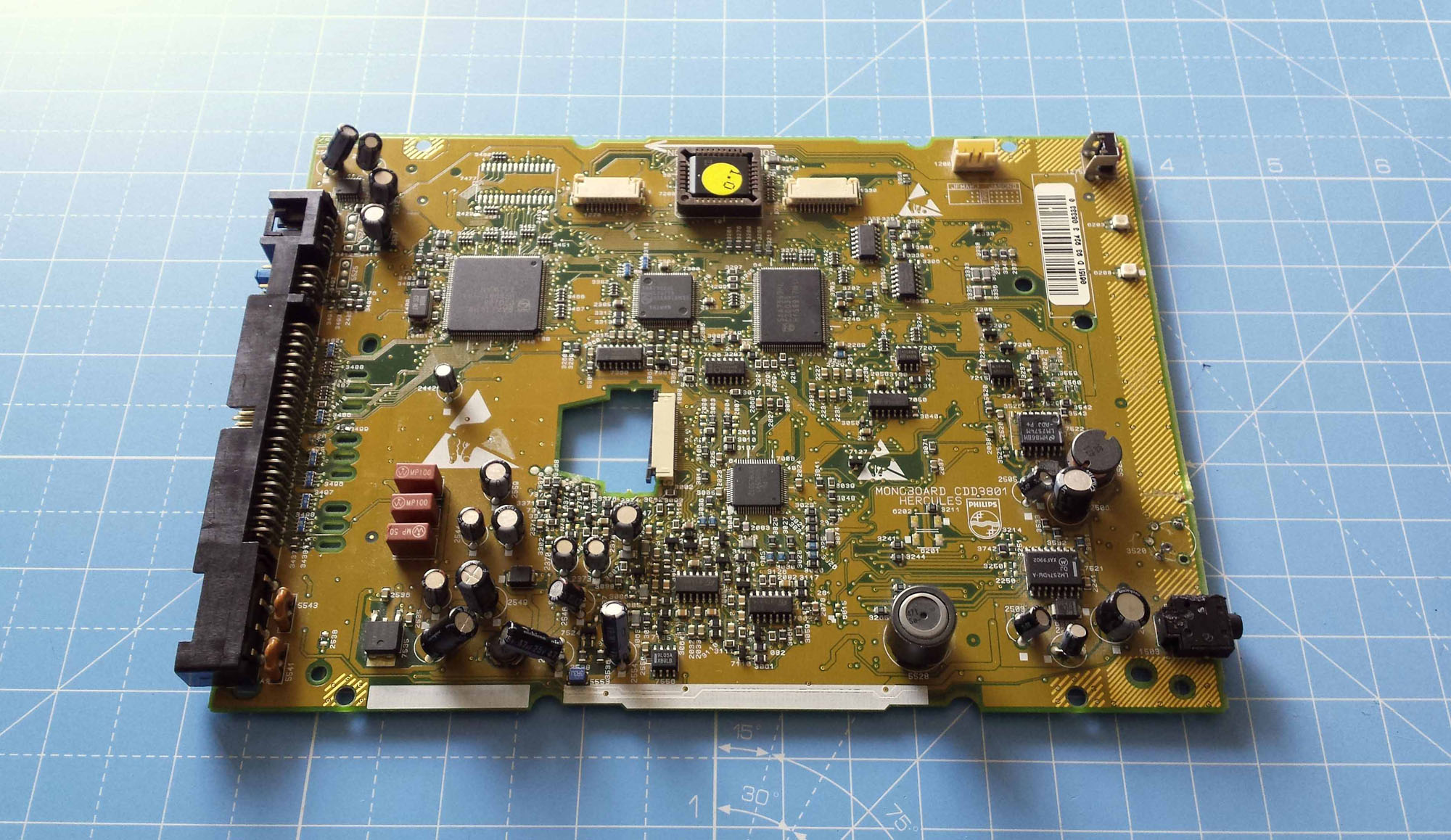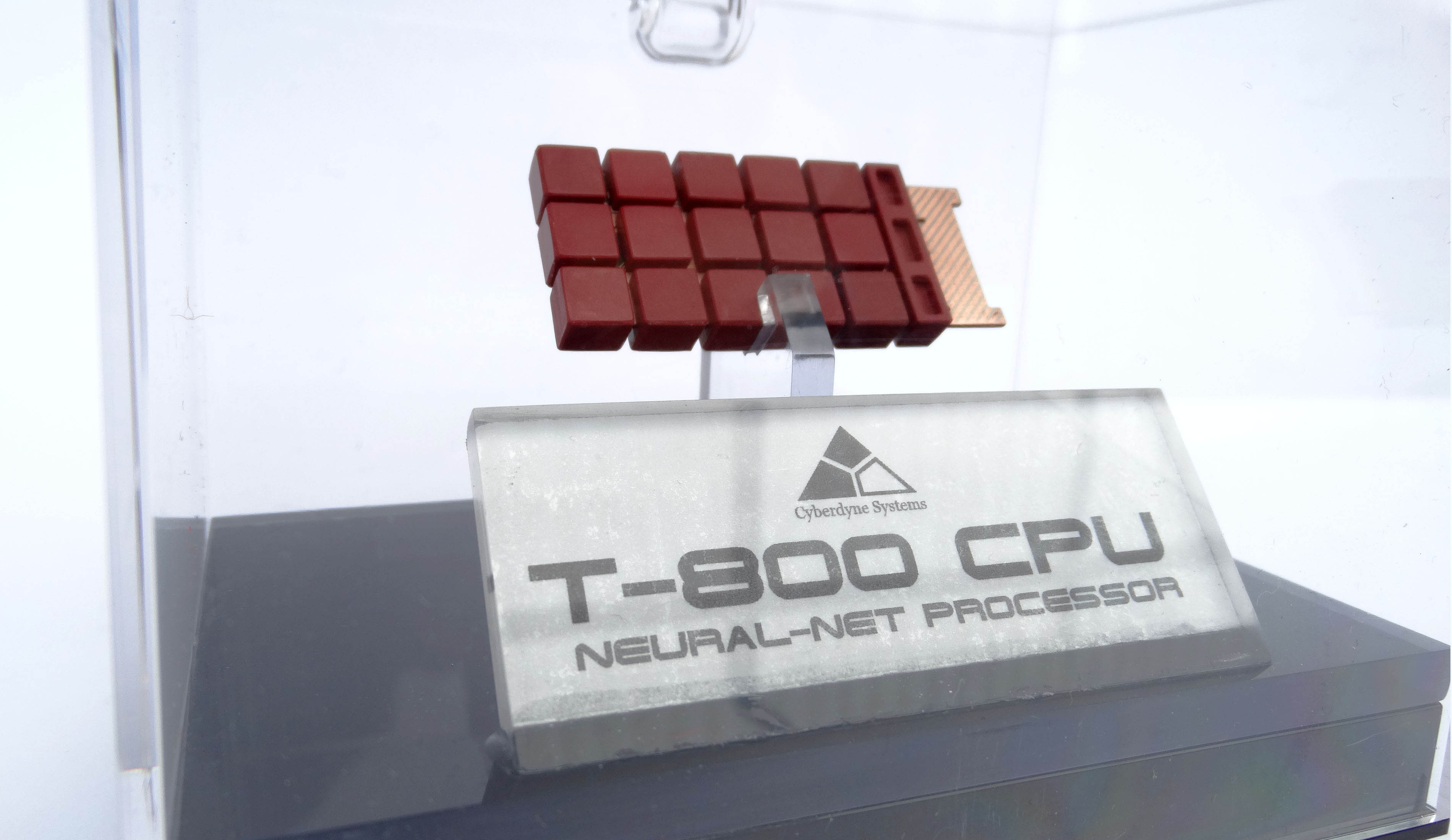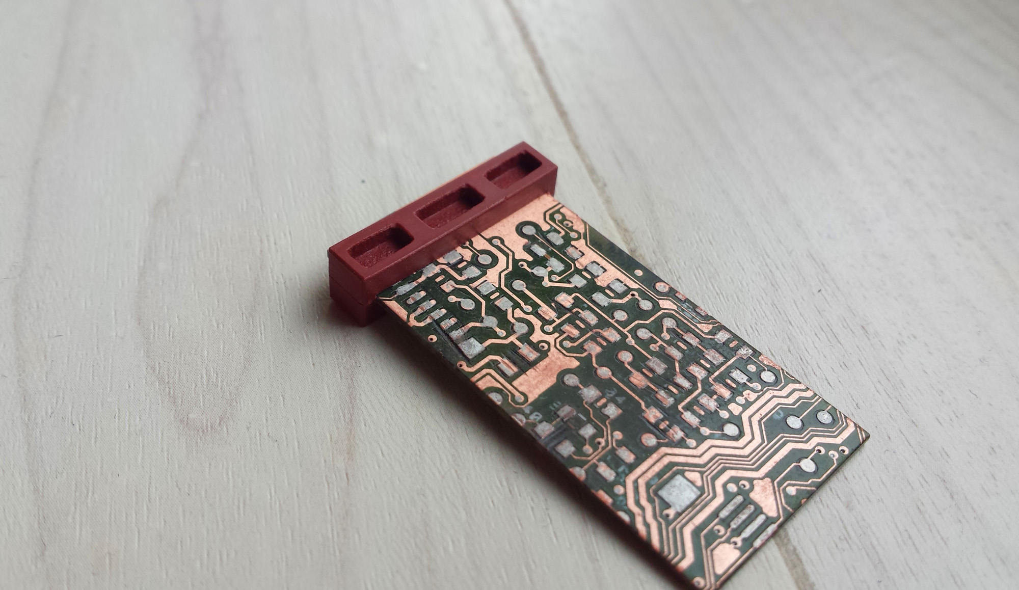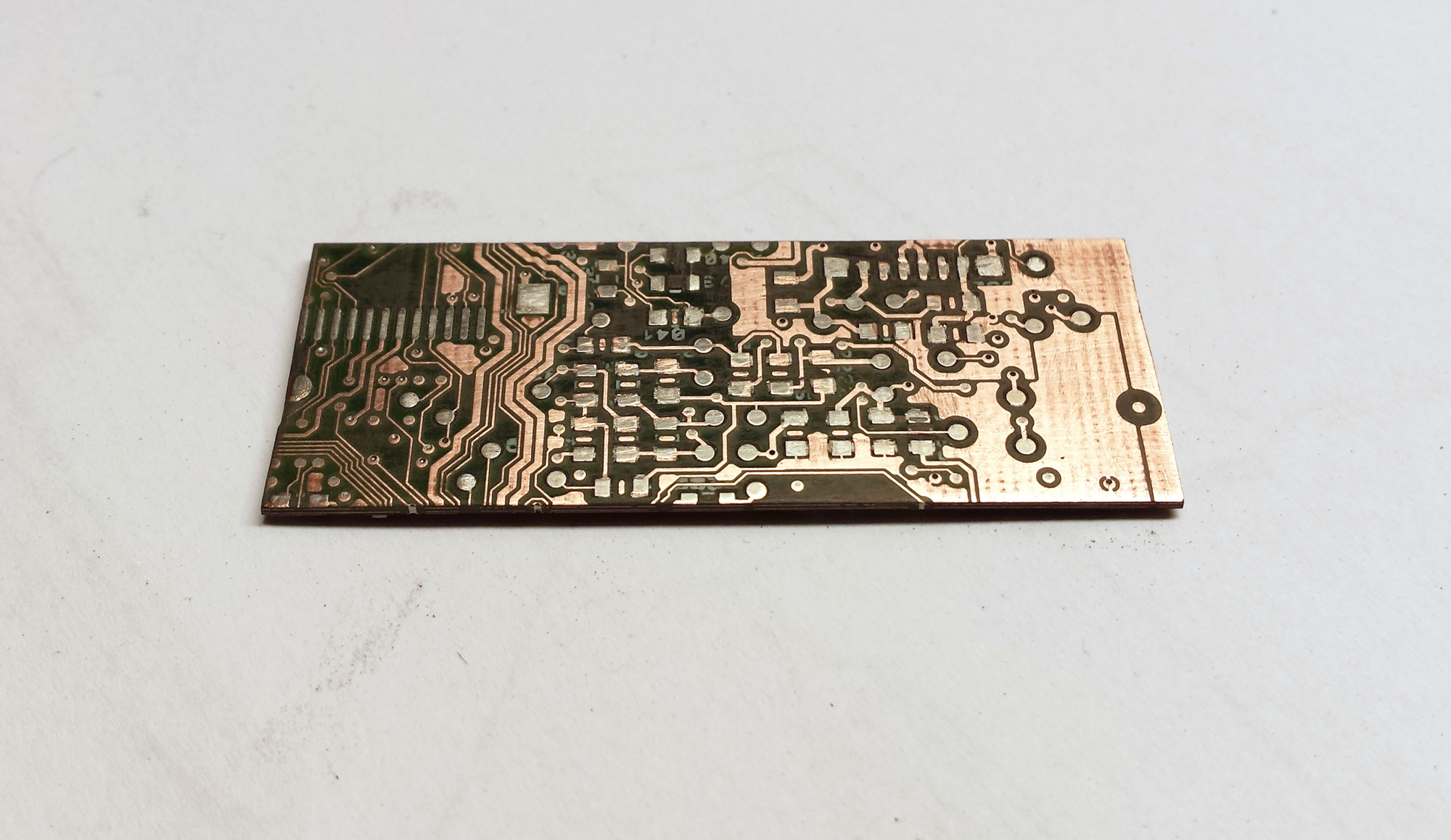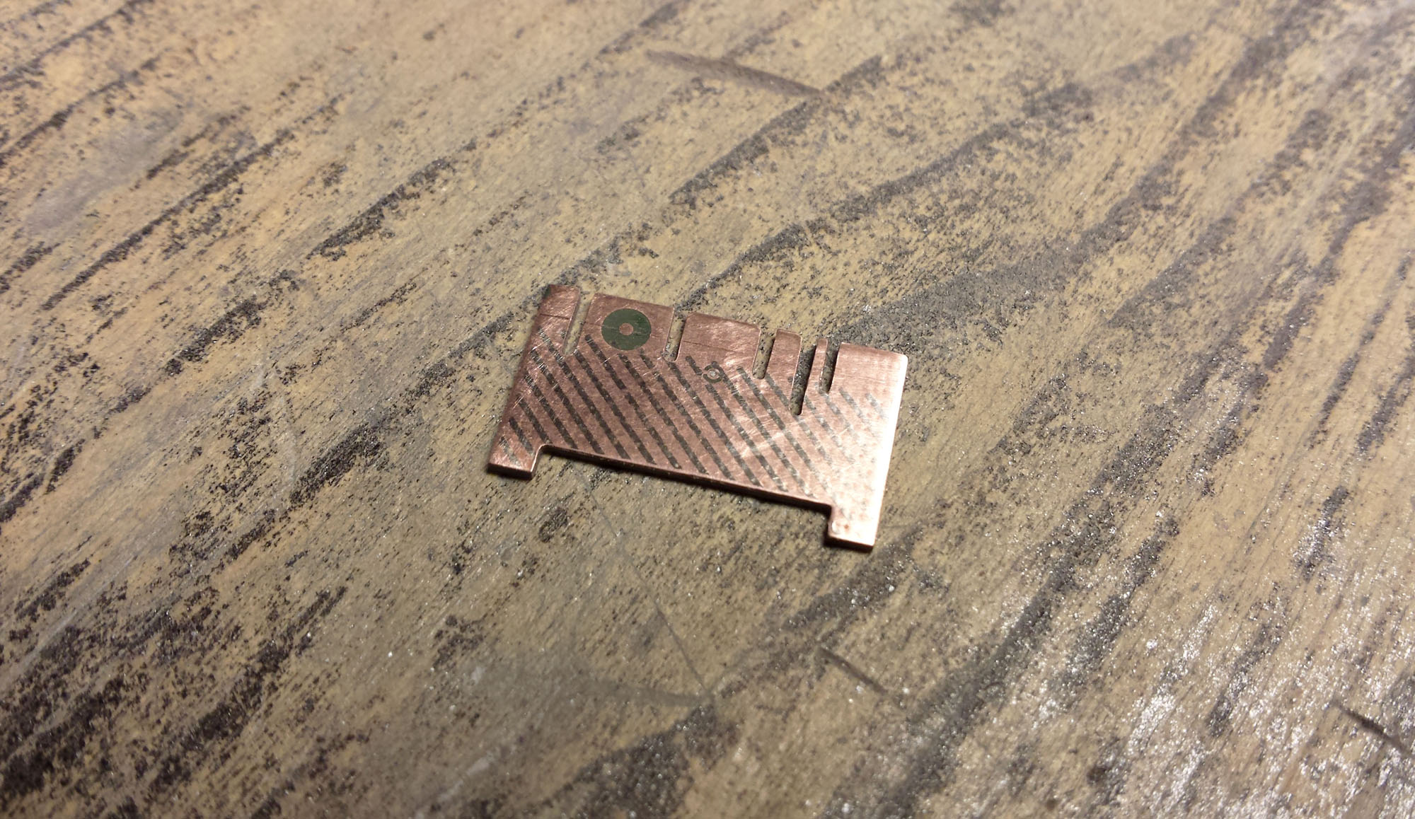 Aus einer alten Platine wird die Grundplatte herausgeschnitten und die oberste Schutzschicht abgeschliffen, sodass die Kupfer-Leiterbahnen zum Vorschein kommen. Als Referenz für die Größe nutze ich ein Papiermodell des Chips und einige Screenshots aus dem originalen Film.