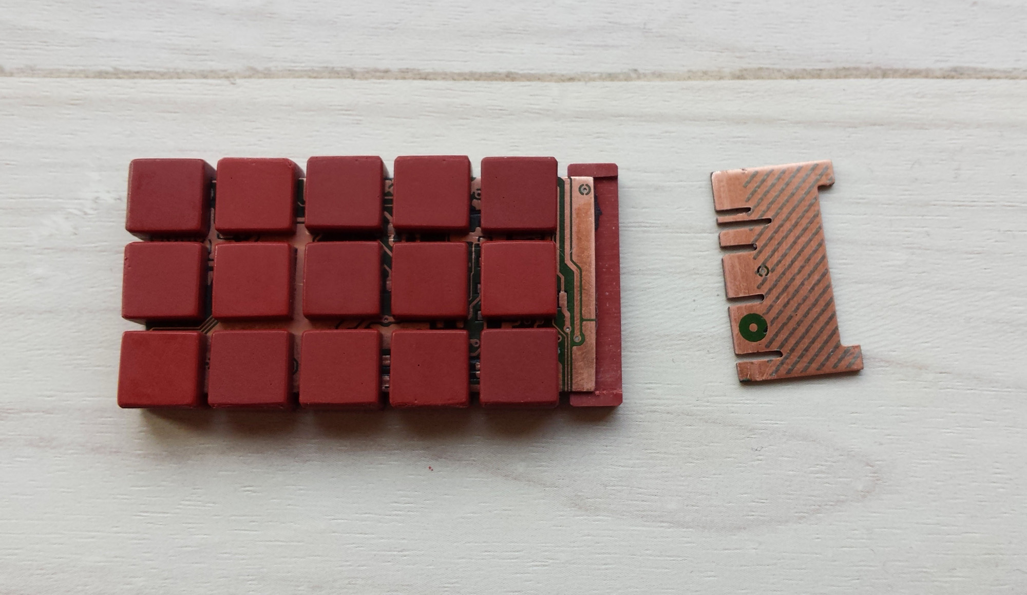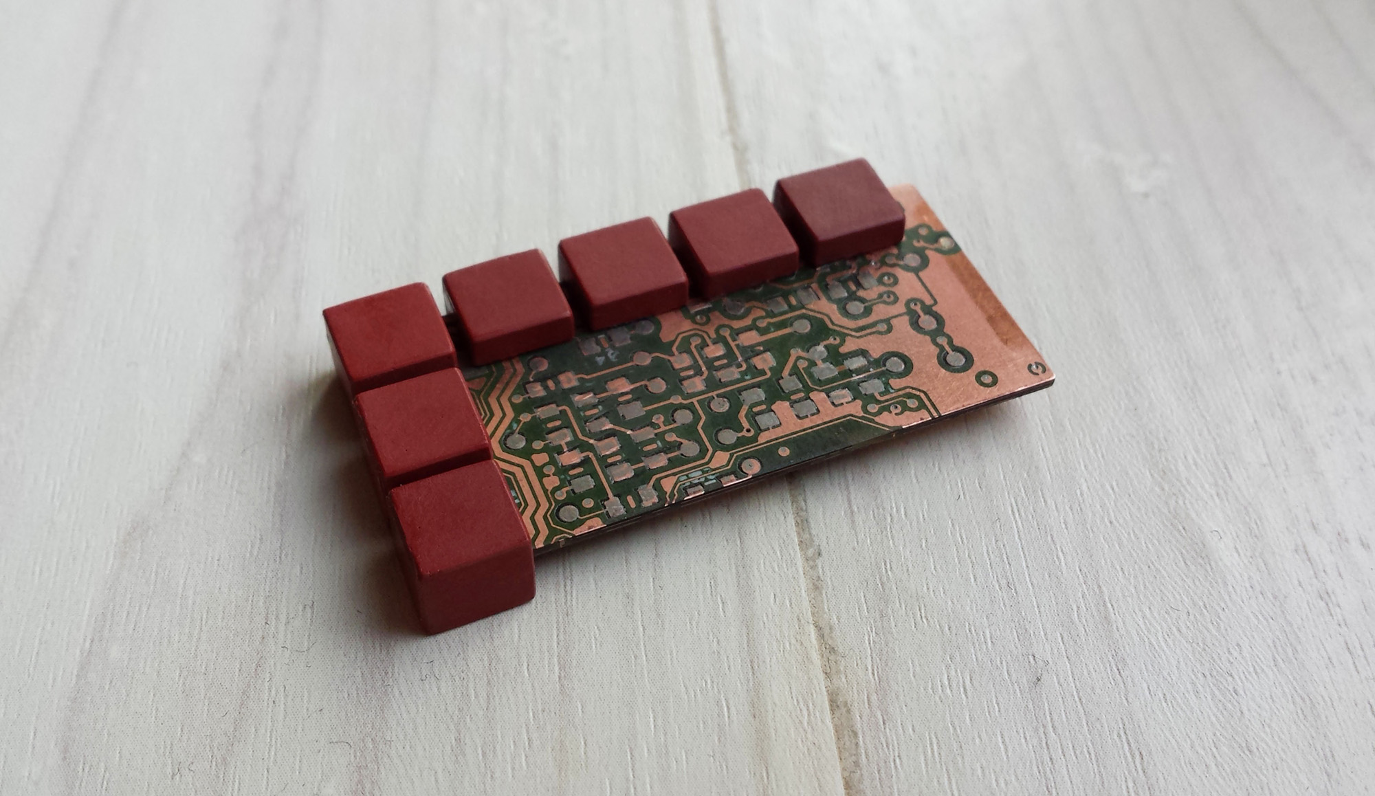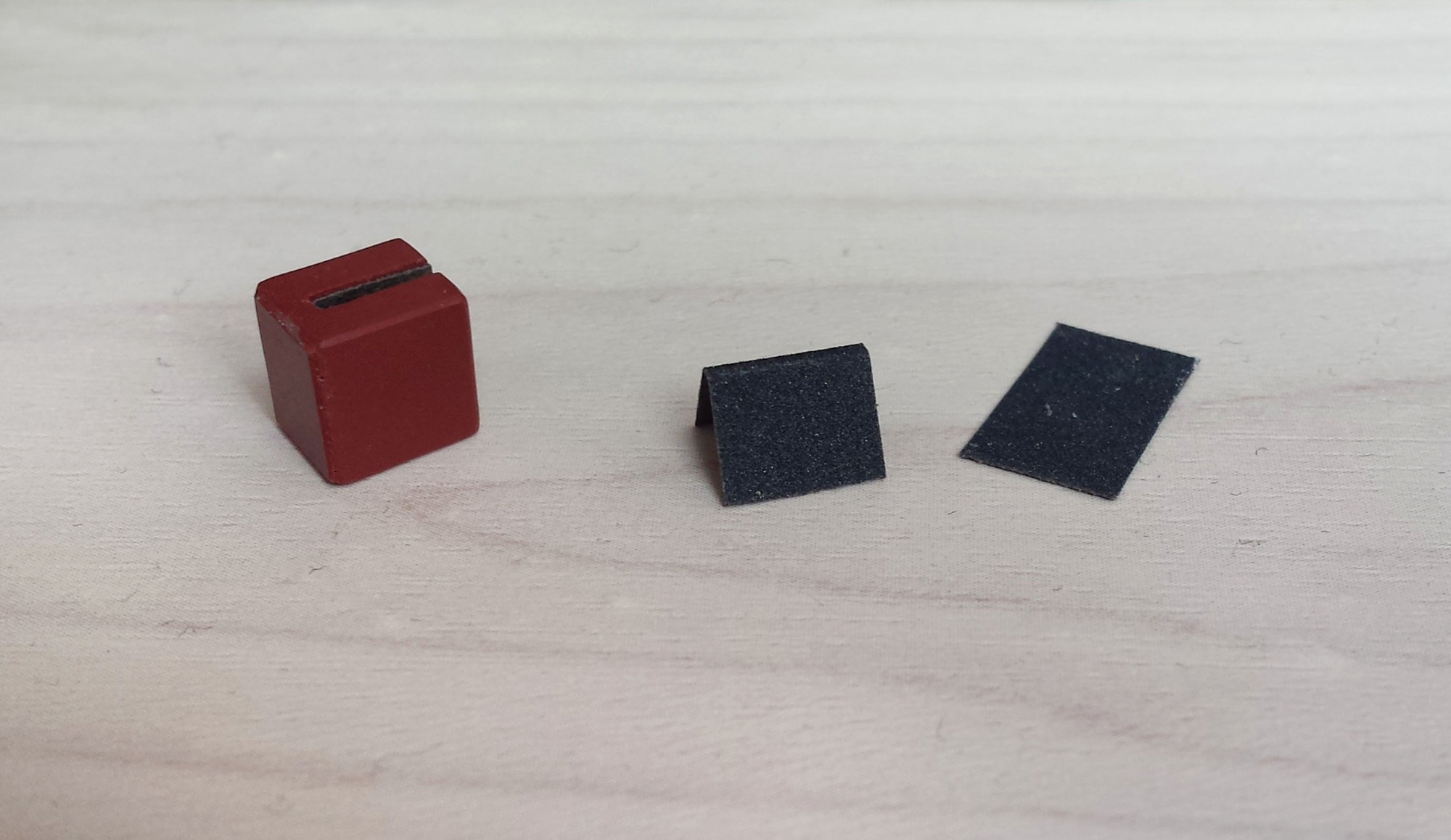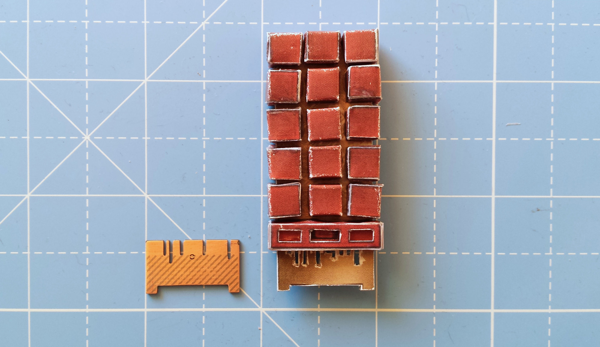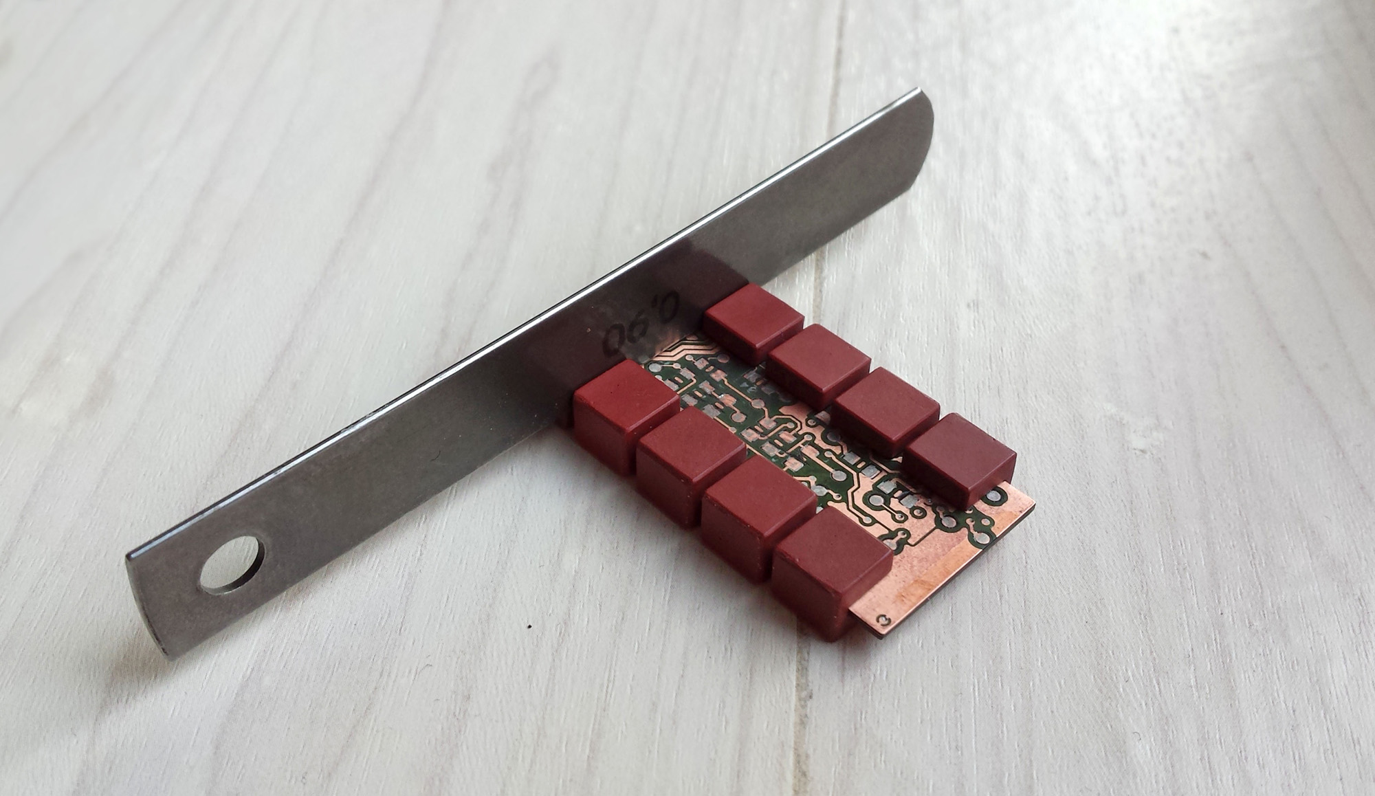 Damit ein schwebender Charakter erzielt wird, klebe ich dünne schwarze Papierstreifen zwischen den Würfeln und der Platine. Mit einer Maßlehre wird der Abstand zwischen den Würfeln eingehalten und mit Sekundenkleber wird geklebt.