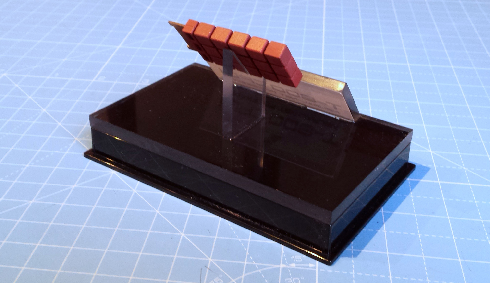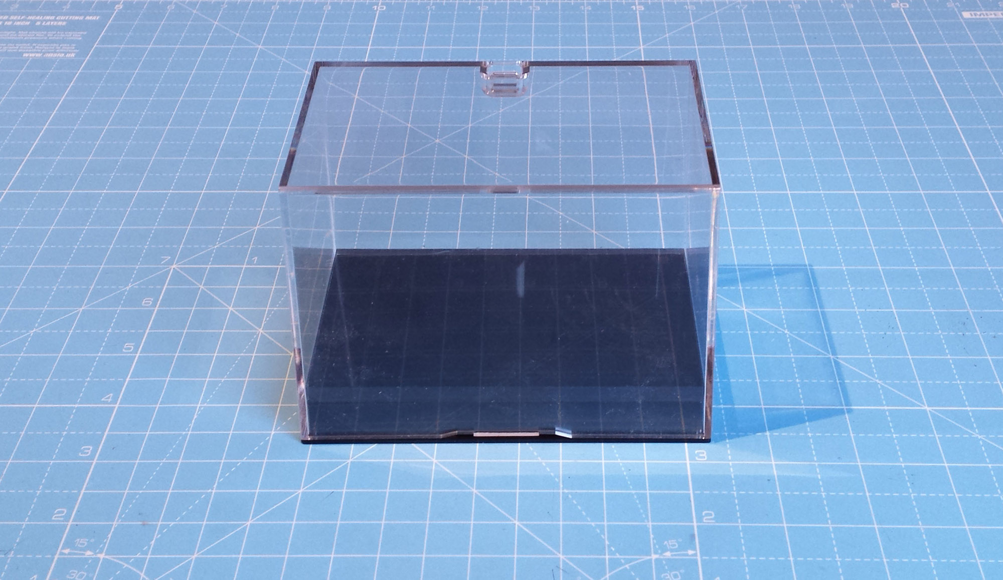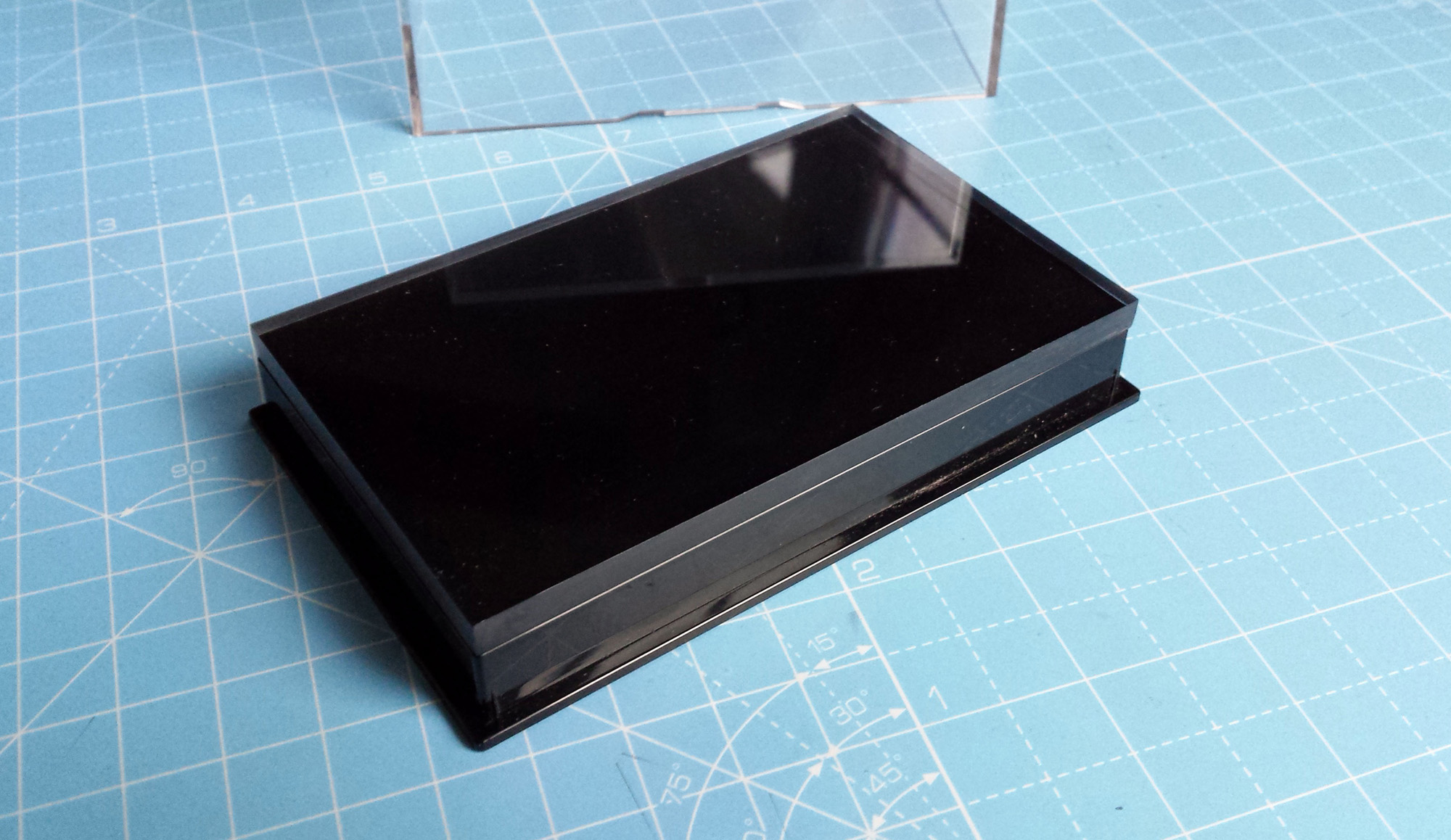 Als geeigneter Aufbewahrungsort für den Chip bietet sich eine Vitrine an, die ich von einem Elektronik-Artikel übrig hatte. Eine von unten schwarz lackeirte Polycarbonat-Platte wird auf den Boden geklebt und erzeugt durch die spiegelnde Fläche eine wertigere Anmutung.