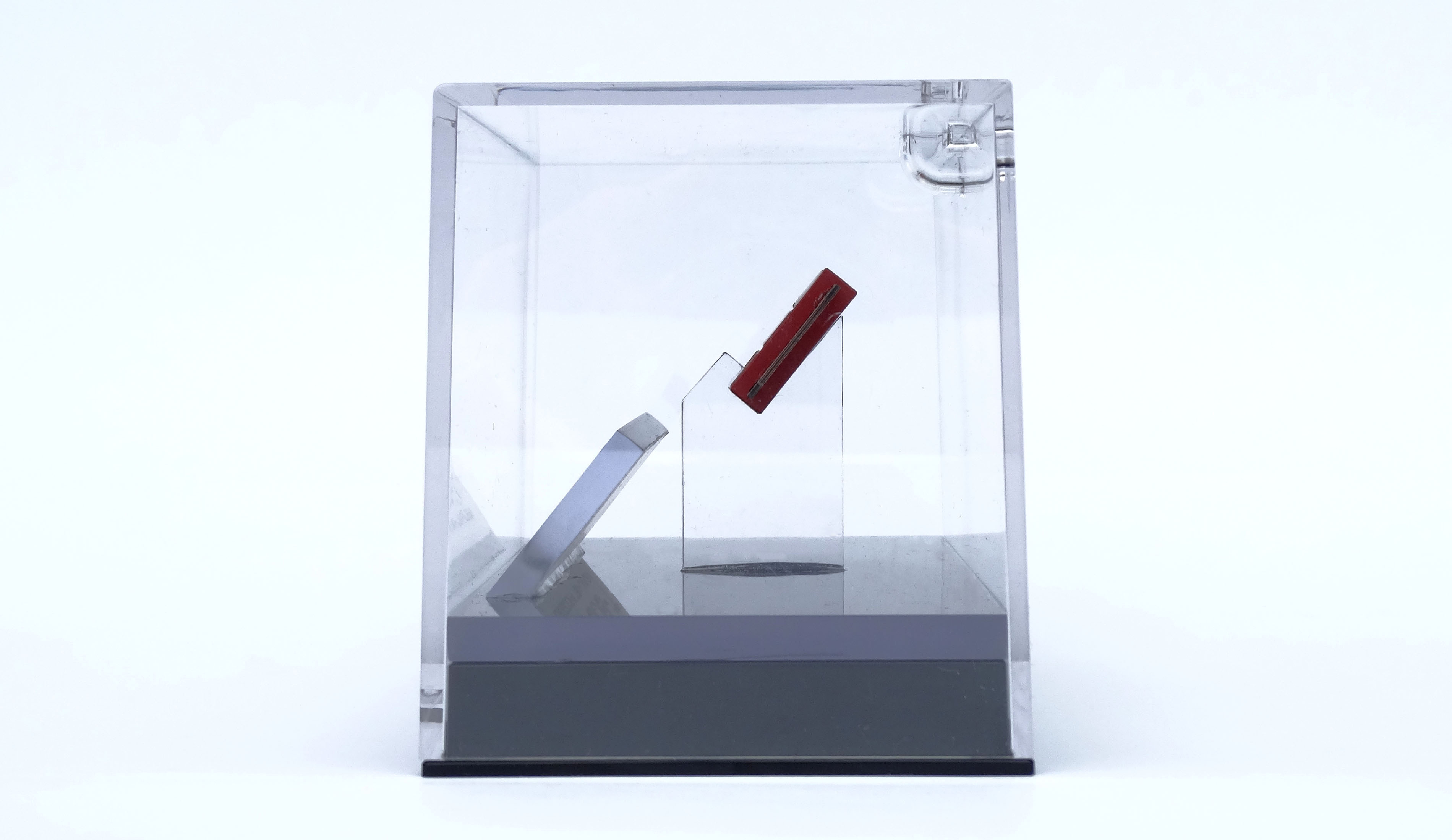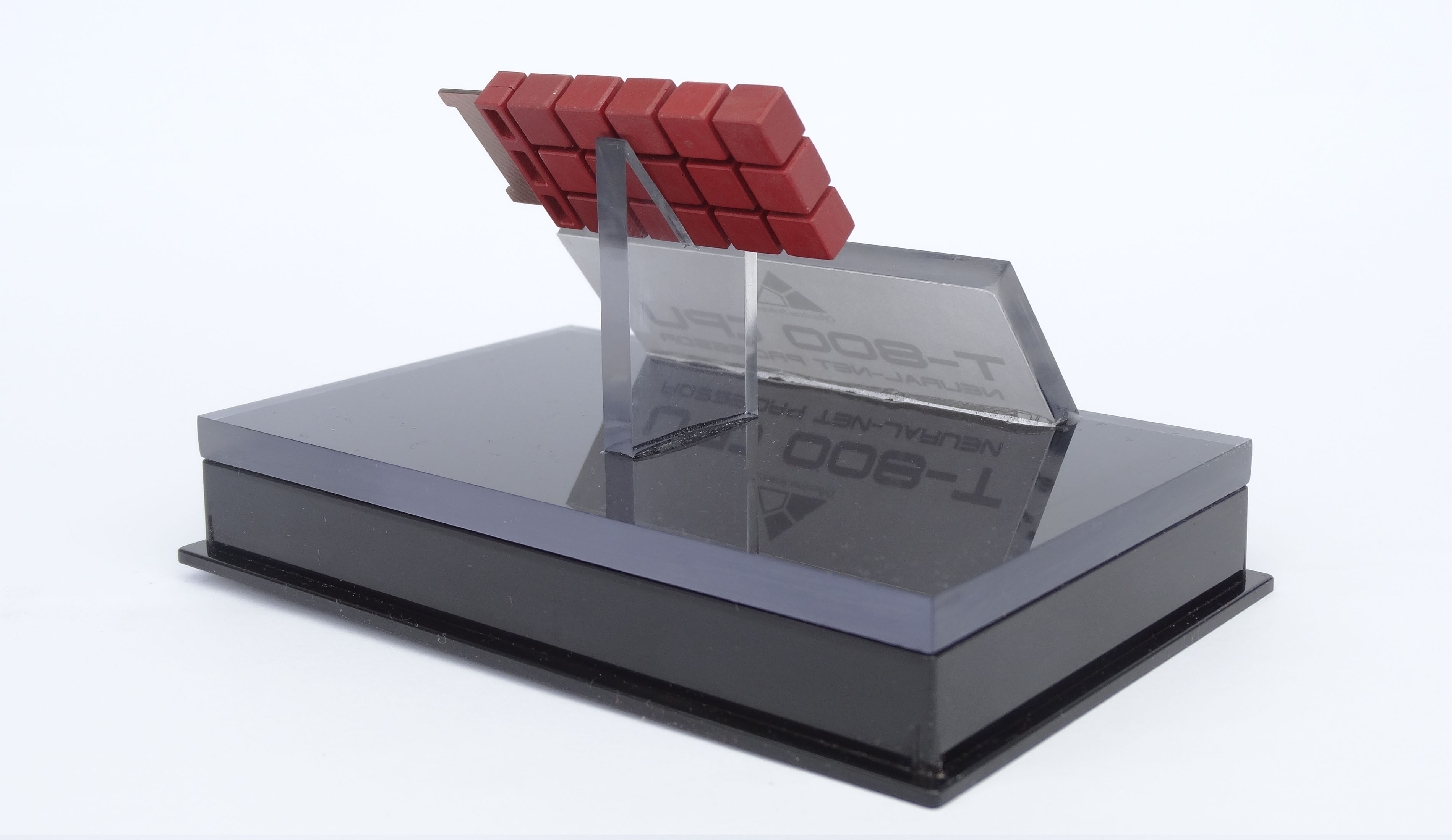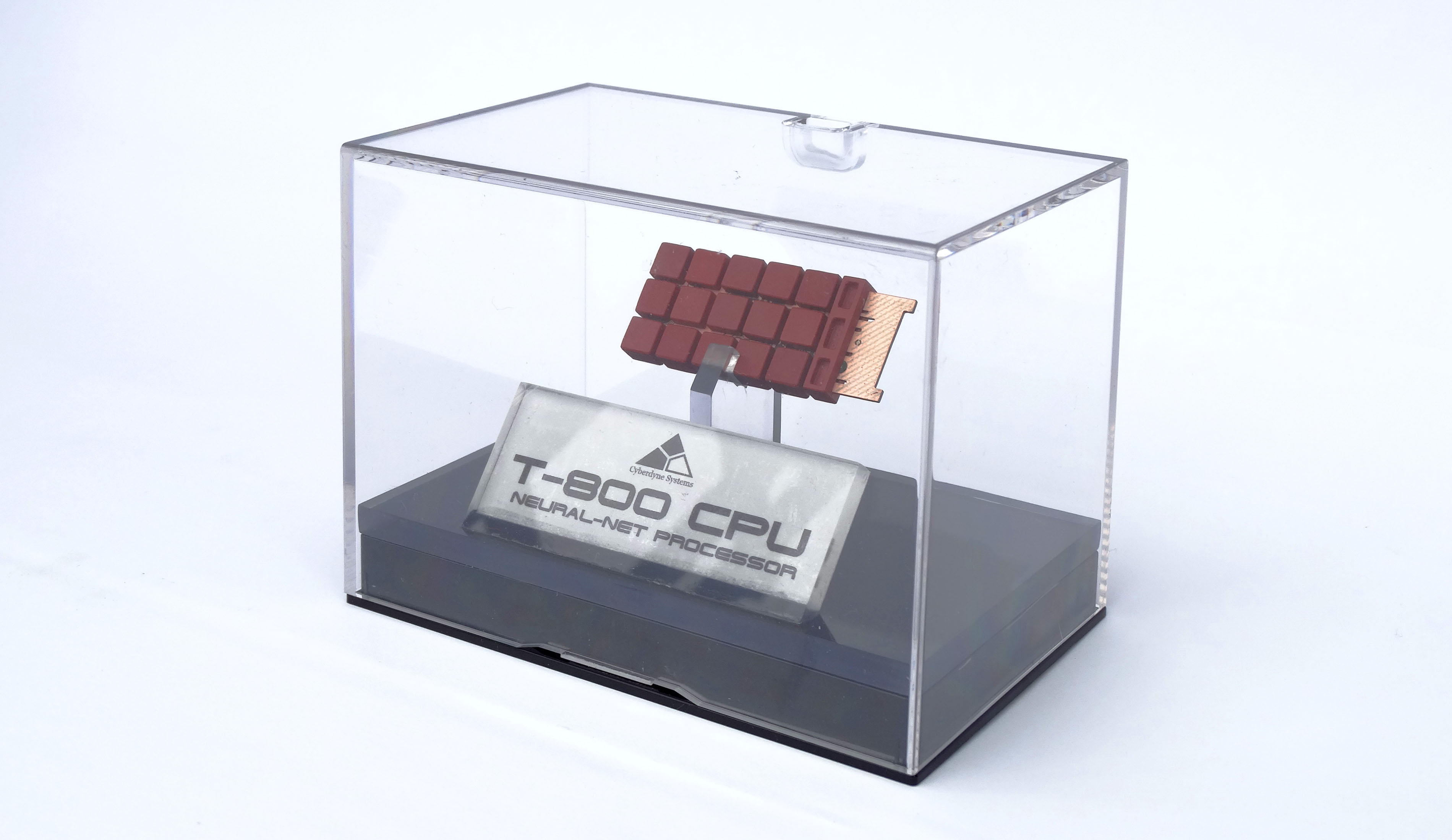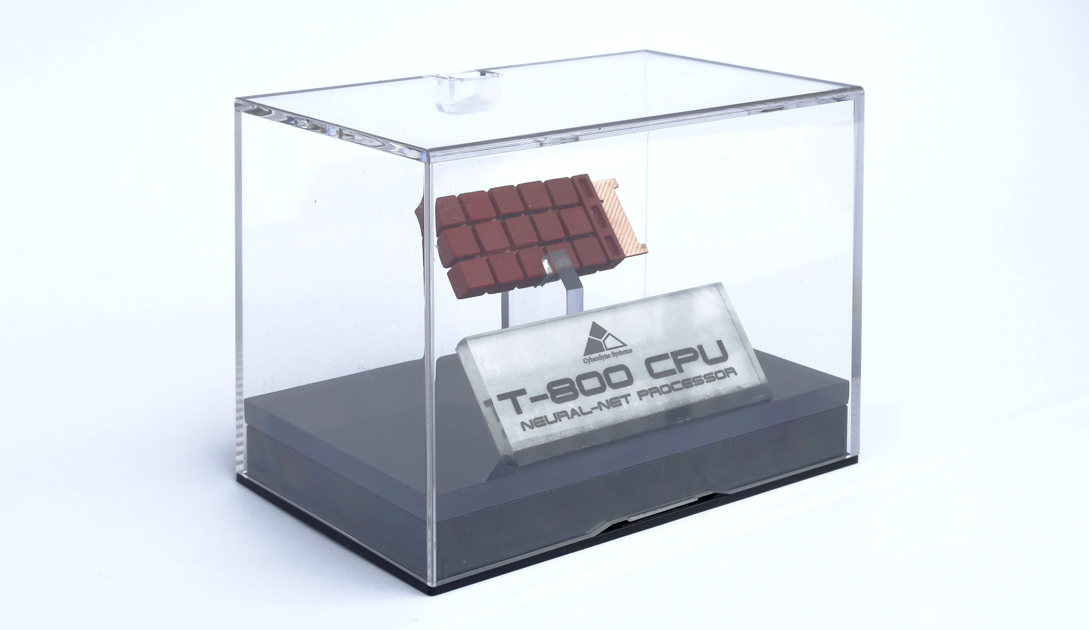 Als geeigneter Aufbewahrungsort für den Chip bietet sich eine Vitrine an, die ich von einem Elektronik-Artikel übrig hatte. Eine von unten schwarz lackeirte Polycarbonat-Platte wird auf den Boden geklebt und erzeugt durch die spiegelnde Fläche eine wertigere Anmutung.