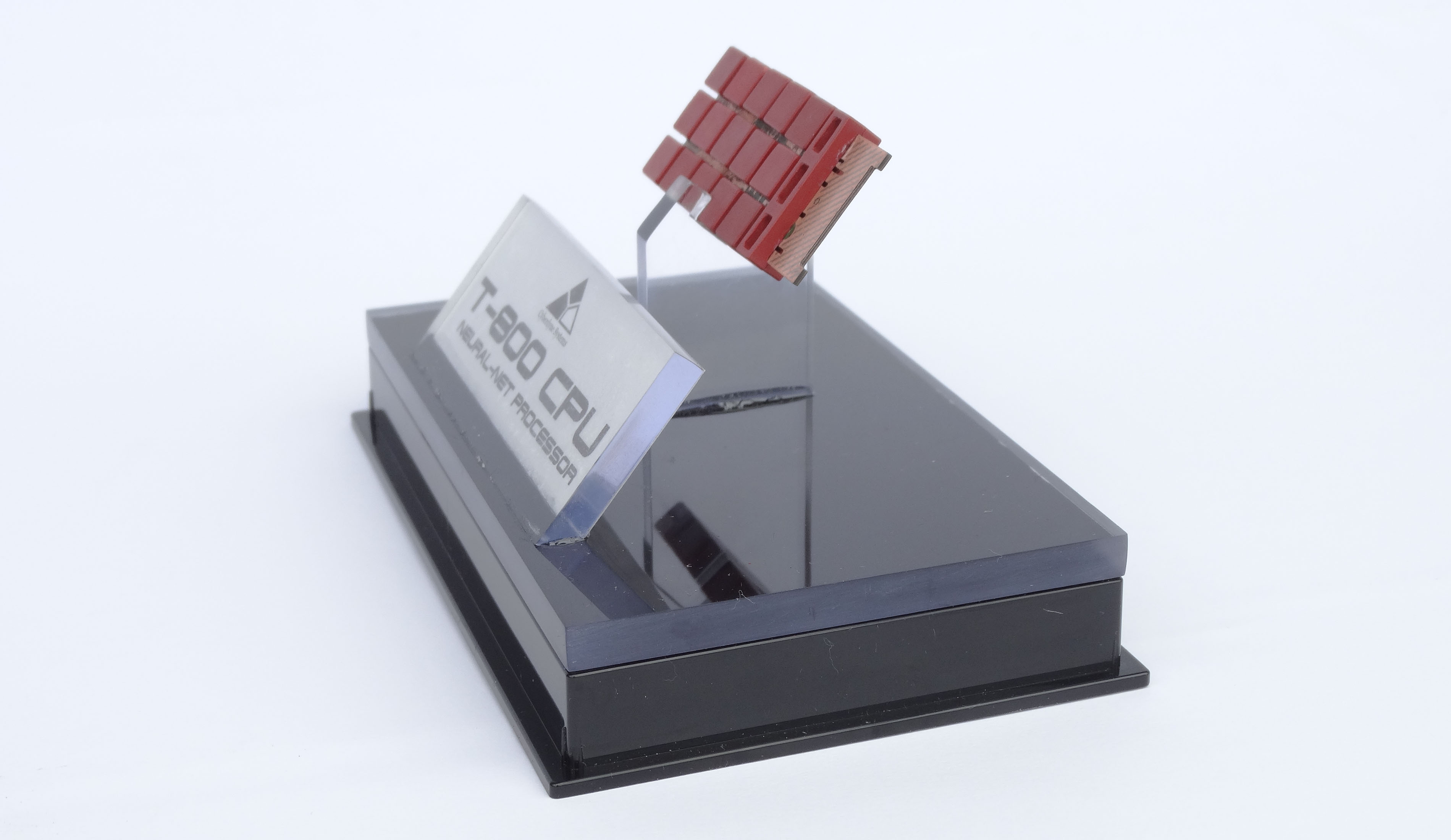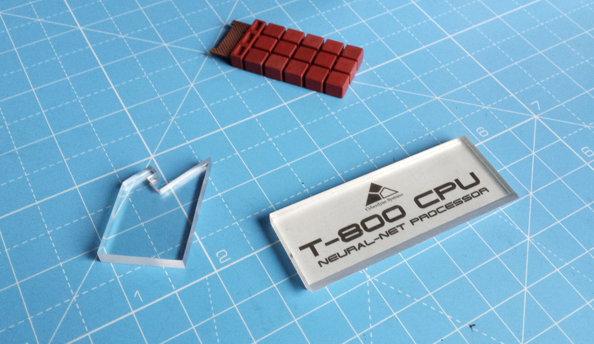 Ein passendes Schild darf natürlich nicht fehlen und wird am PC mit entsprechenden Logos und Bezeichnungen zusammengestellt und auf einer halbtransparenten Folie ausgedruckt. Die Schnittkanten des Schildes und der Halterung für den Chip werden poliert und die Einzelteile zum Schluss mit Epoxidkleber verbunden.