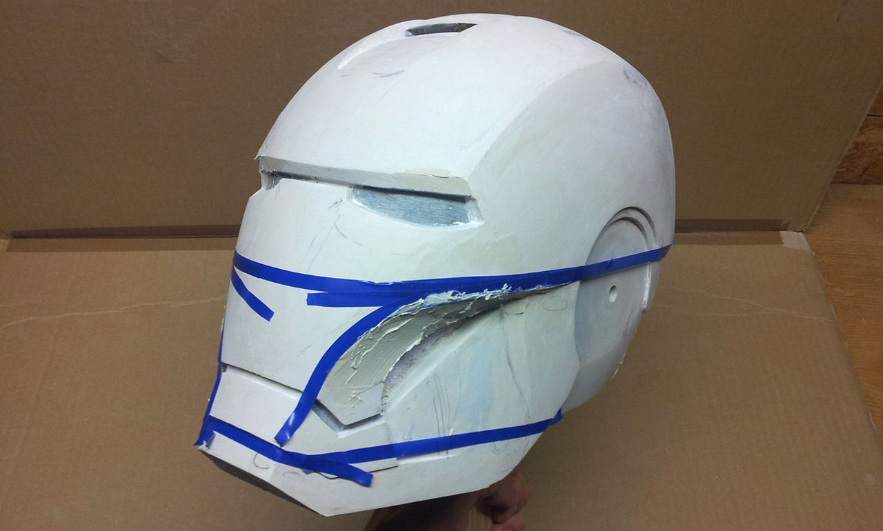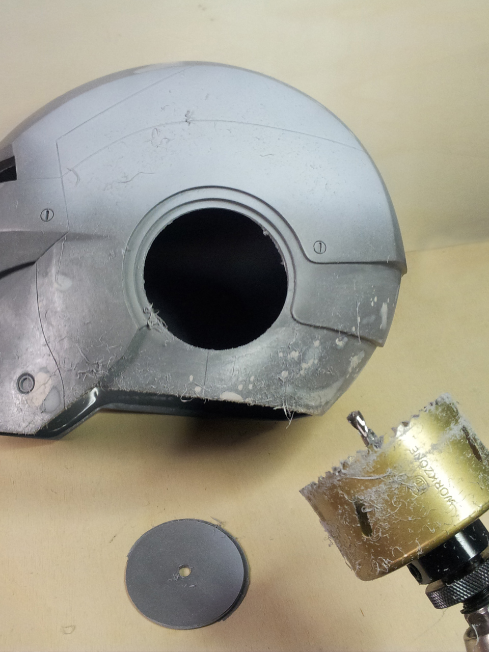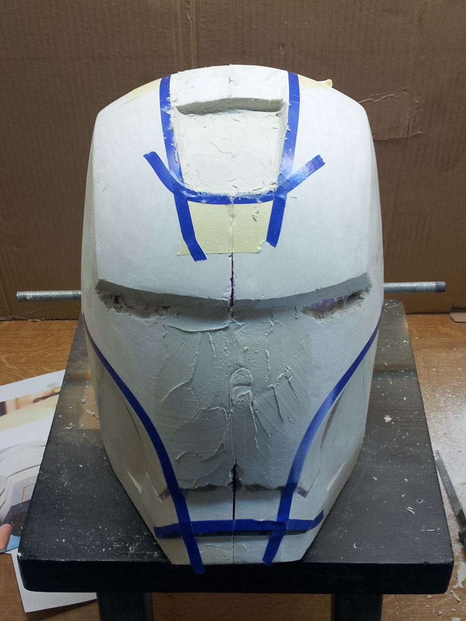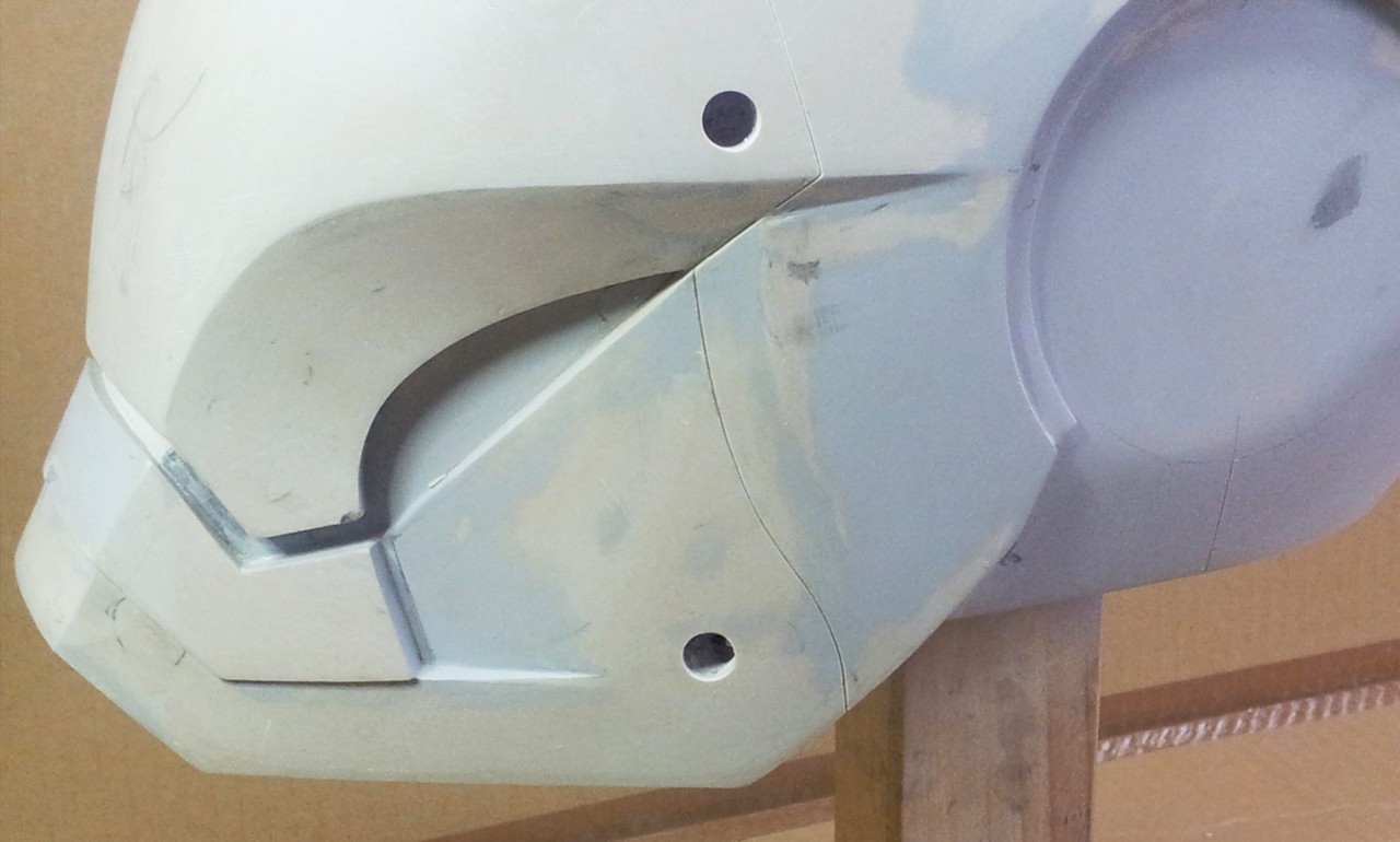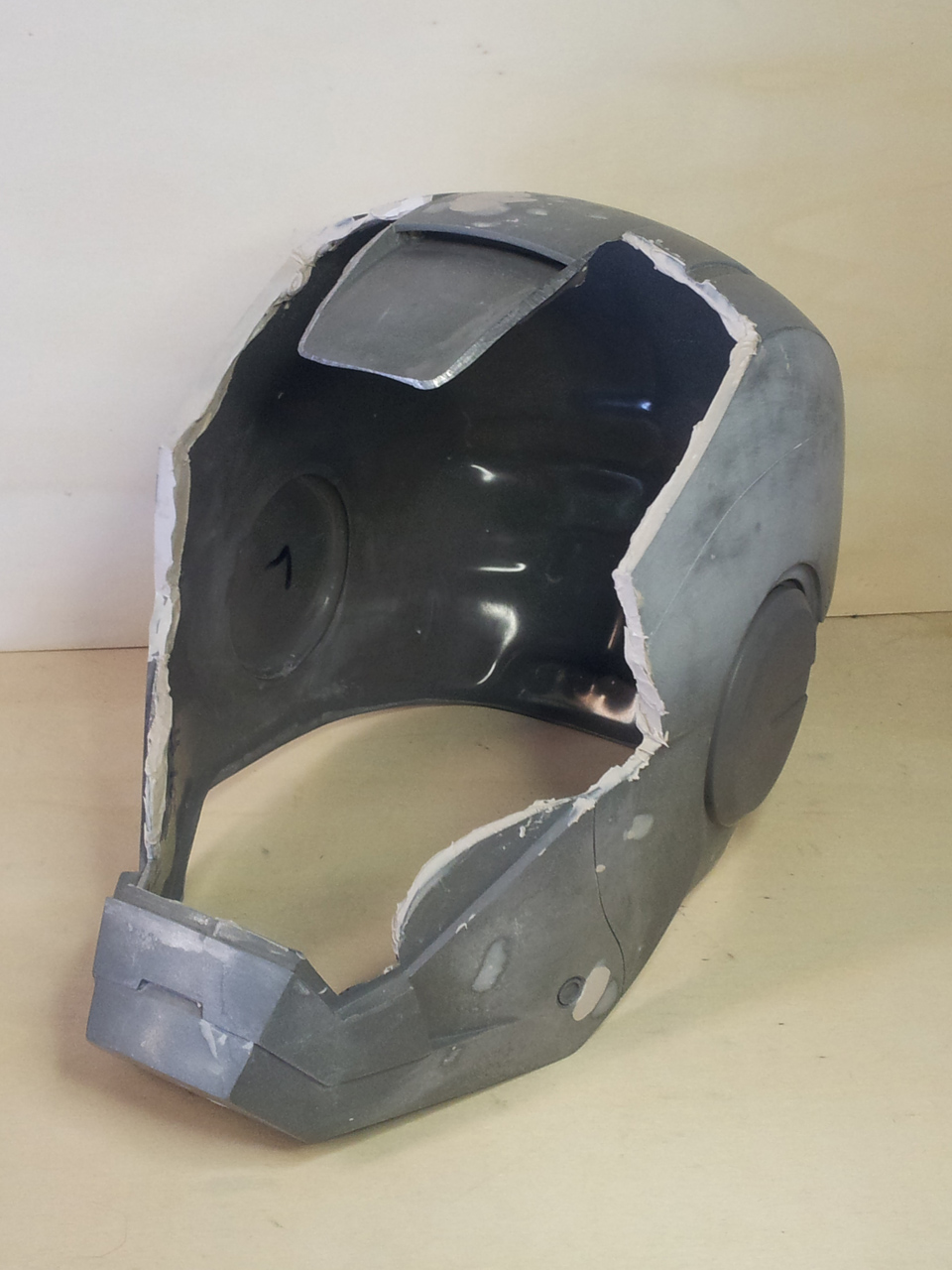 Da der Helm später mal eine abnehmbare Faceplate besitzen soll, wird mit der Stichsäge die komplette Front abgetrennt und die Kanten geschliffen und mit Spachtelmasse modelliert. Die Ohren wurden mittlerweile mit Sekundenkleber angeklebt.