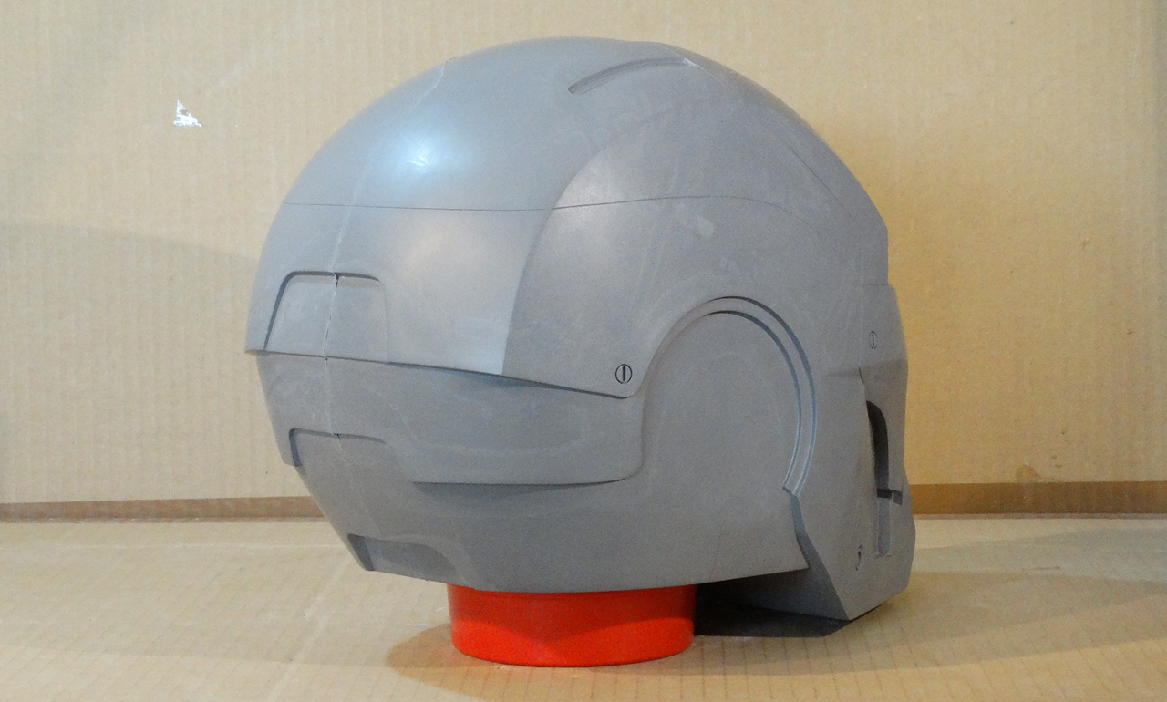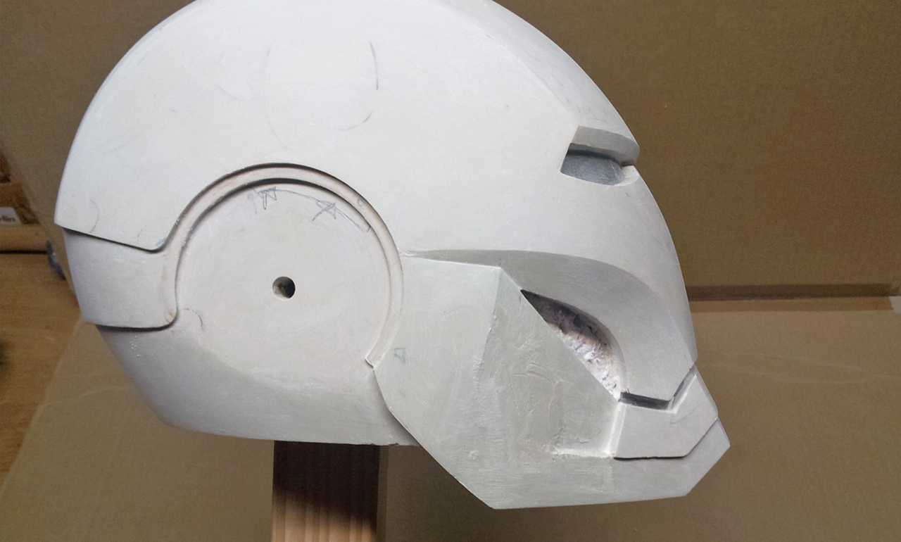 An den Seiten bringe ich Bohrungen für die separat gegossenen Ohren ein. Diese wurden ebenfalls wie der Helm in Silikon abgeformt und per Rotocast Verfahren mit Gießharz dupliziert.