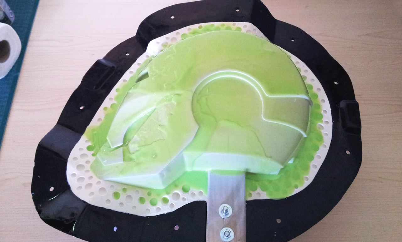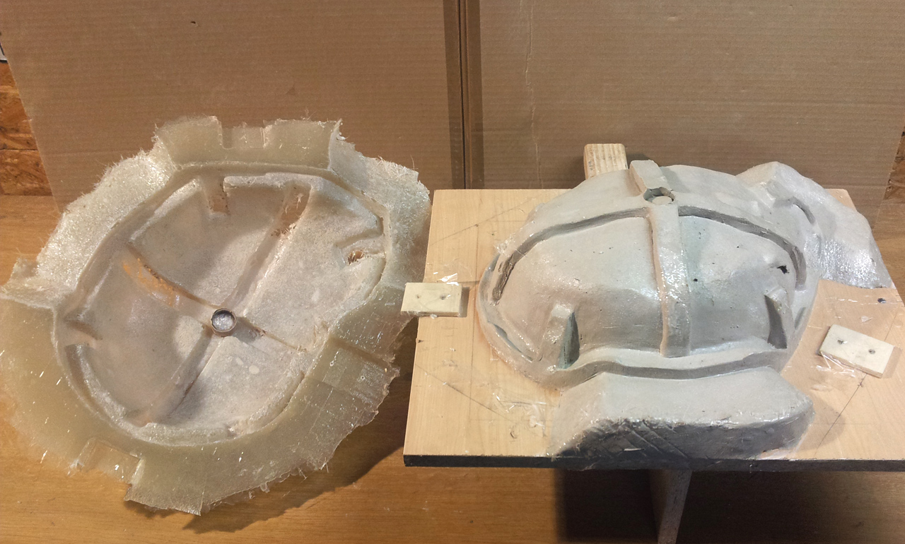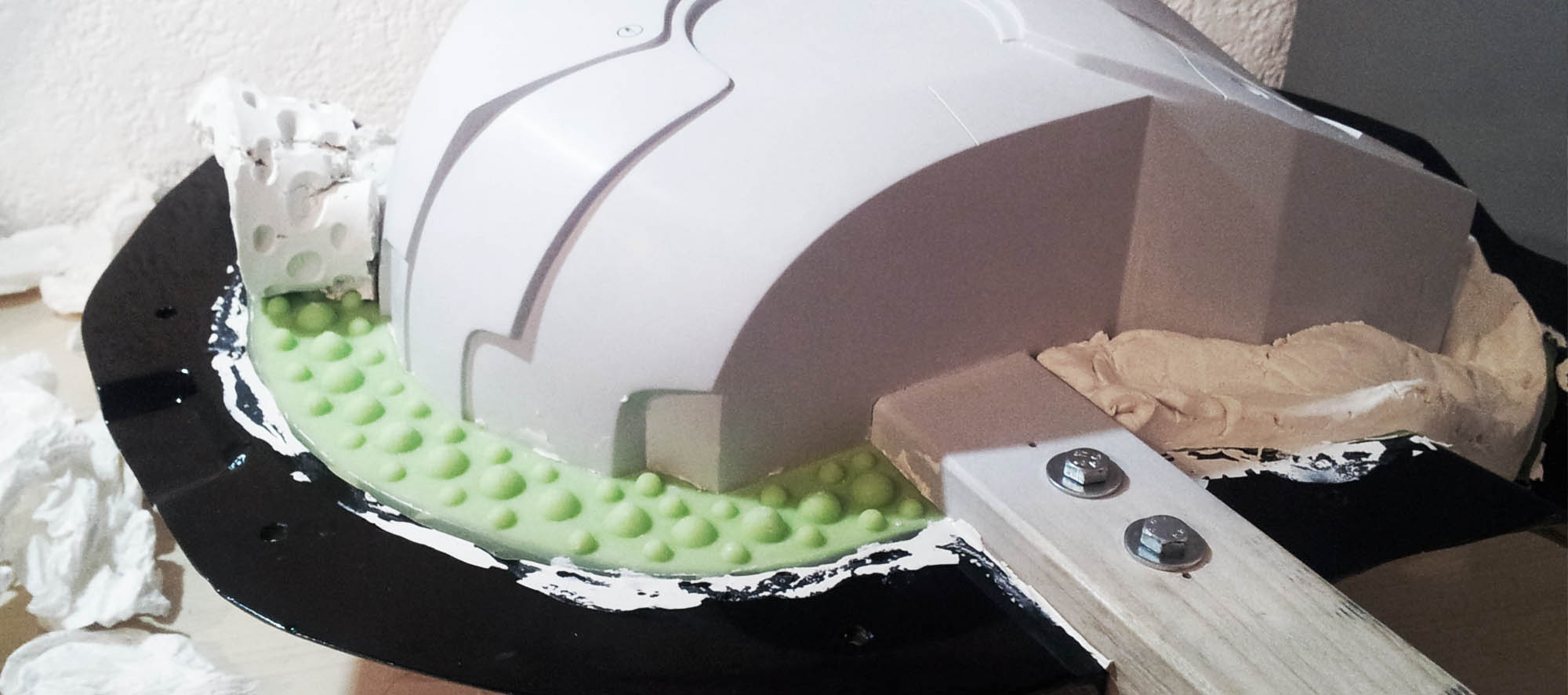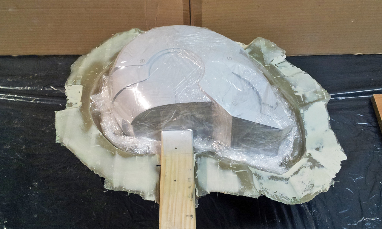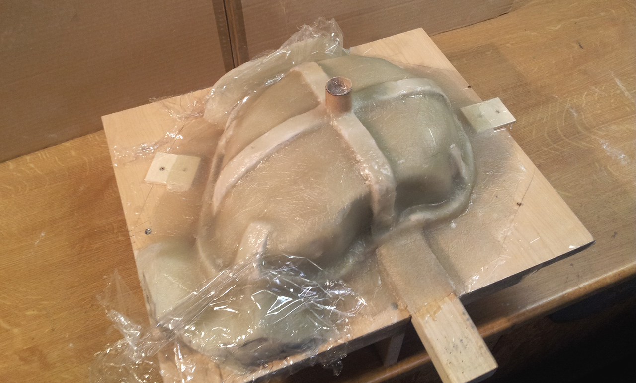 Das Urmodell wird in einer zweiteiligen Silikonform abgeformt. Hierfür muss zuerst ein Untergestell aus Holz gebaut werden, in der sich die Hälfte des Helms versenken lässt. Anschließend wird mit Ton eine ca. 1-2cm dicke Schicht auf den mit Frischhaltefolie umwickelten Helm aufgetragen. In dieses Volumen wird später das Silikon gefüllt. Auf den noch feuchten Ton werden Glasfaserschichten aufgebracht und damit die äußere feste Hülle der Silikonform erstellt.