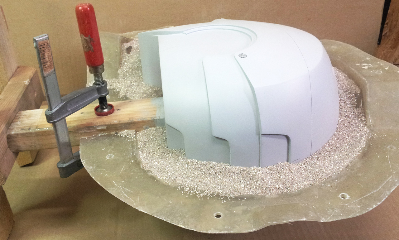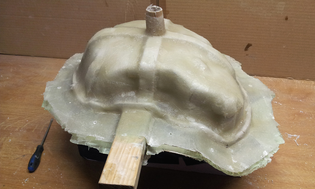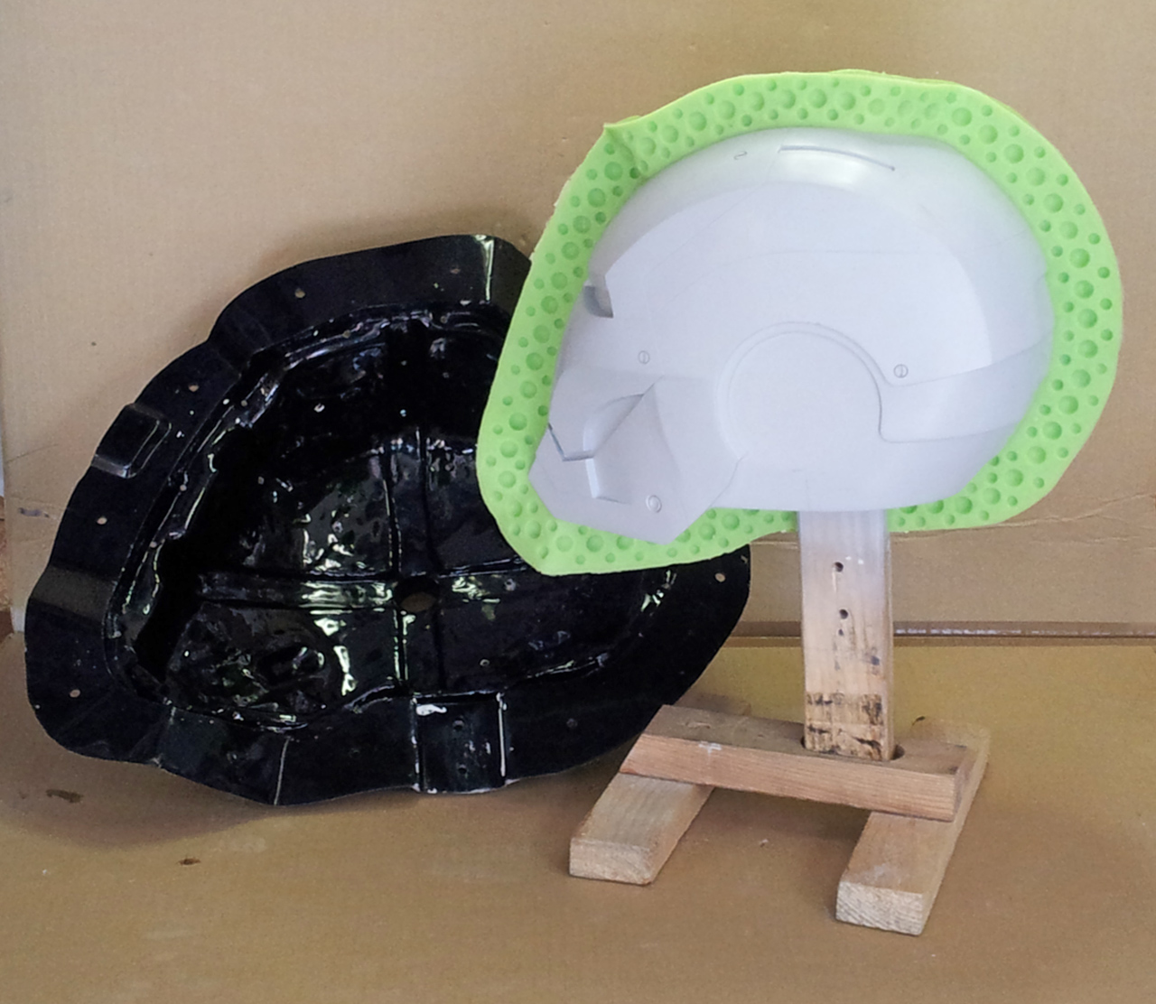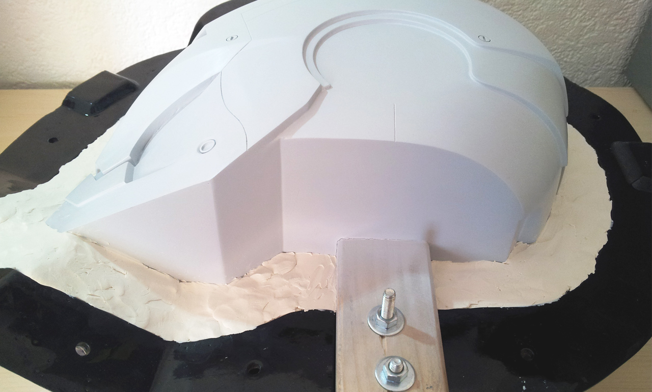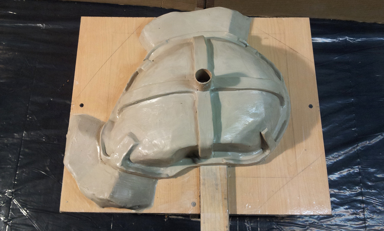 Das Urmodell wird in einer zweiteiligen Silikonform abgeformt. Hierfür muss zuerst ein Untergestell aus Holz gebaut werden, in der sich die Hälfte des Helms versenken lässt. Anschließend wird mit Ton eine ca. 1-2cm dicke Schicht auf den mit Frischhaltefolie umwickelten Helm aufgetragen. In dieses Volumen wird später das Silikon gefüllt. Auf den noch feuchten Ton werden Glasfaserschichten aufgebracht und damit die äußere feste Hülle der Silikonform erstellt.