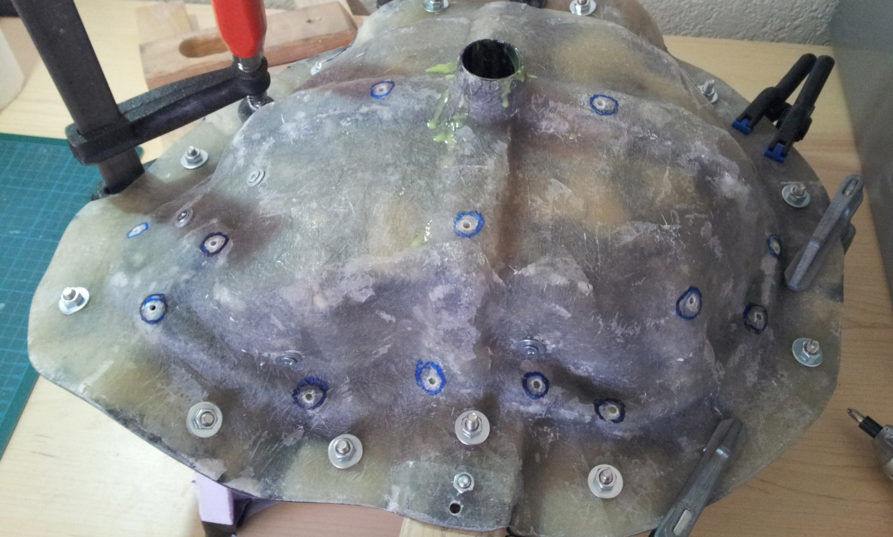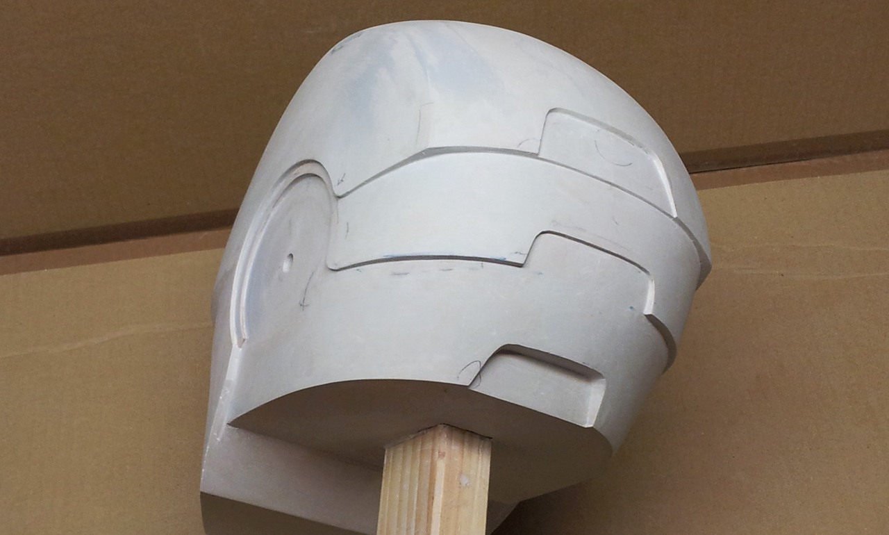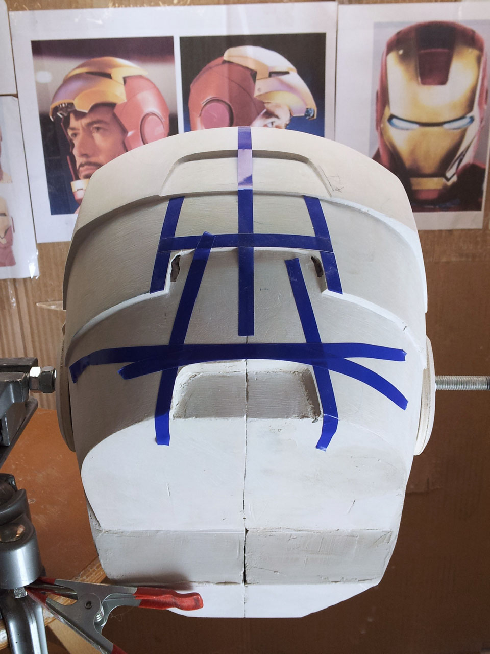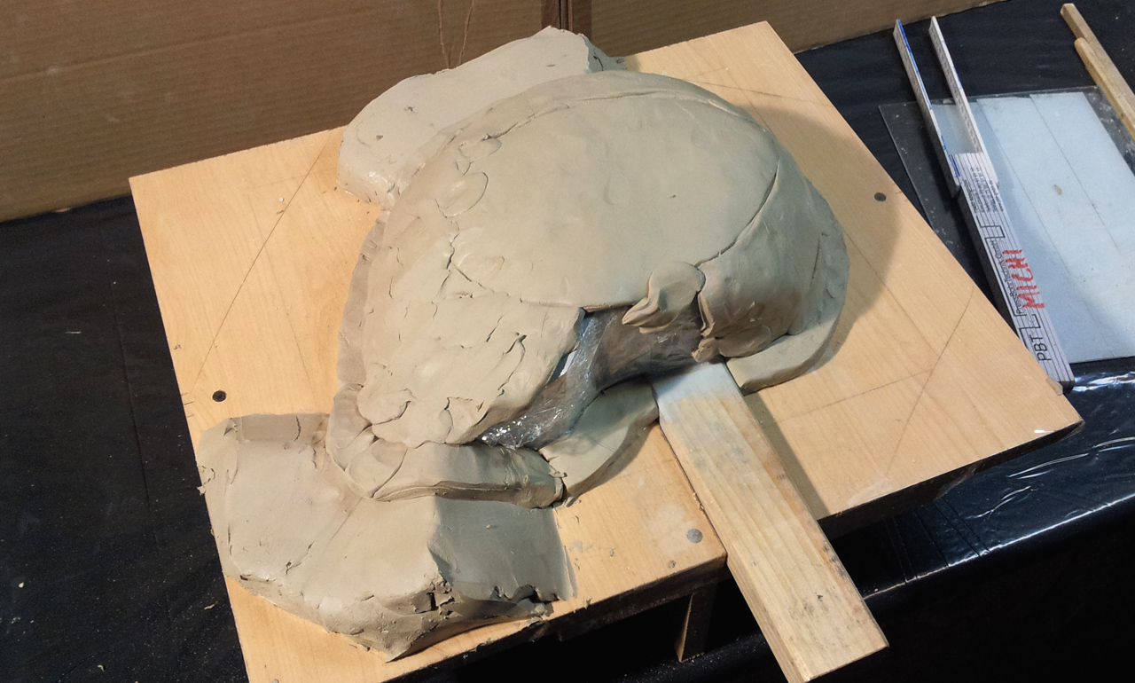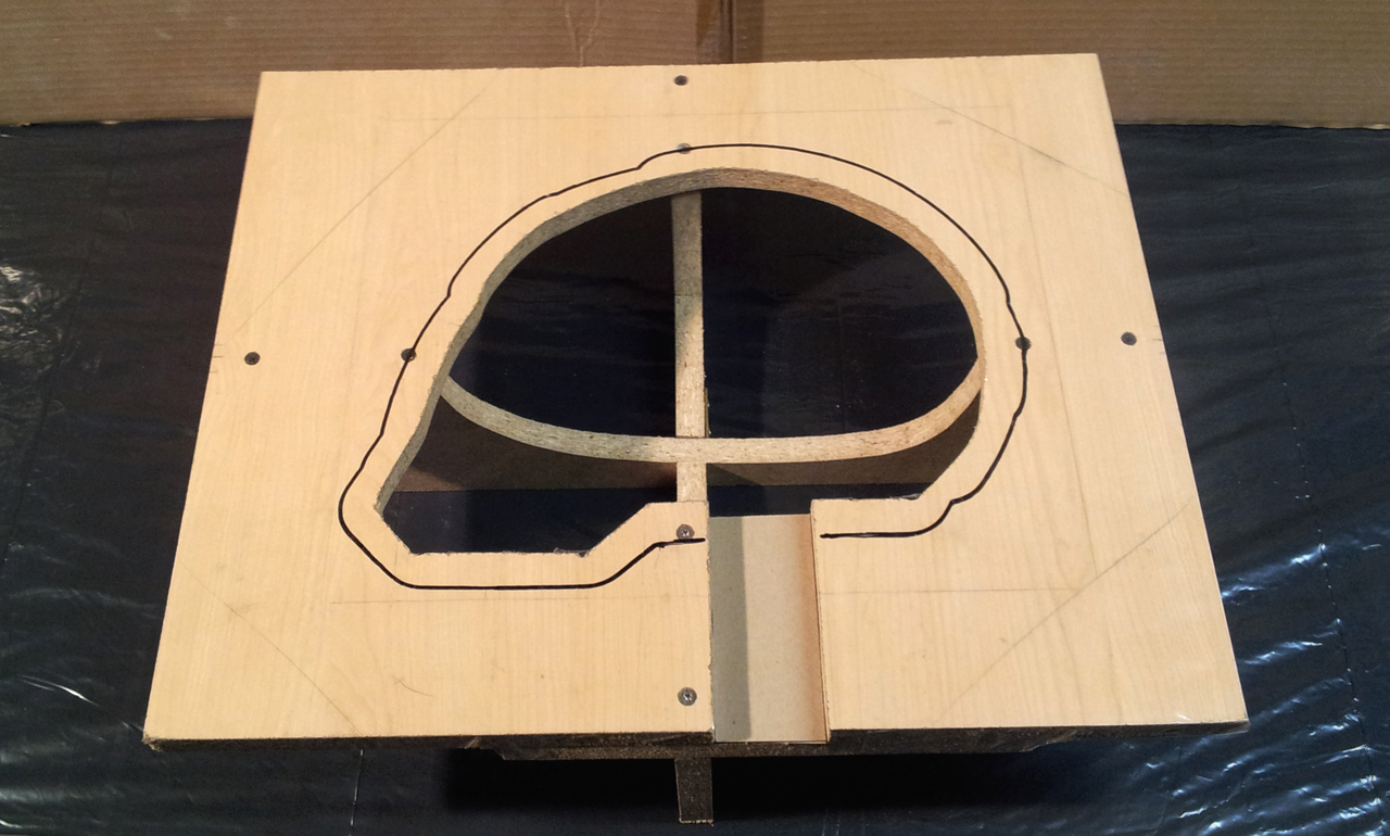 Das Urmodell wird in einer zweiteiligen Silikonform abgeformt. Hierfür muss zuerst ein Untergestell aus Holz gebaut werden, in der sich die Hälfte des Helms versenken lässt. Anschließend wird mit Ton eine ca. 1-2cm dicke Schicht auf den mit Frischhaltefolie umwickelten Helm aufgetragen. In dieses Volumen wird später das Silikon gefüllt. Auf den noch feuchten Ton werden Glasfaserschichten aufgebracht und damit die äußere feste Hülle der Silikonform erstellt.