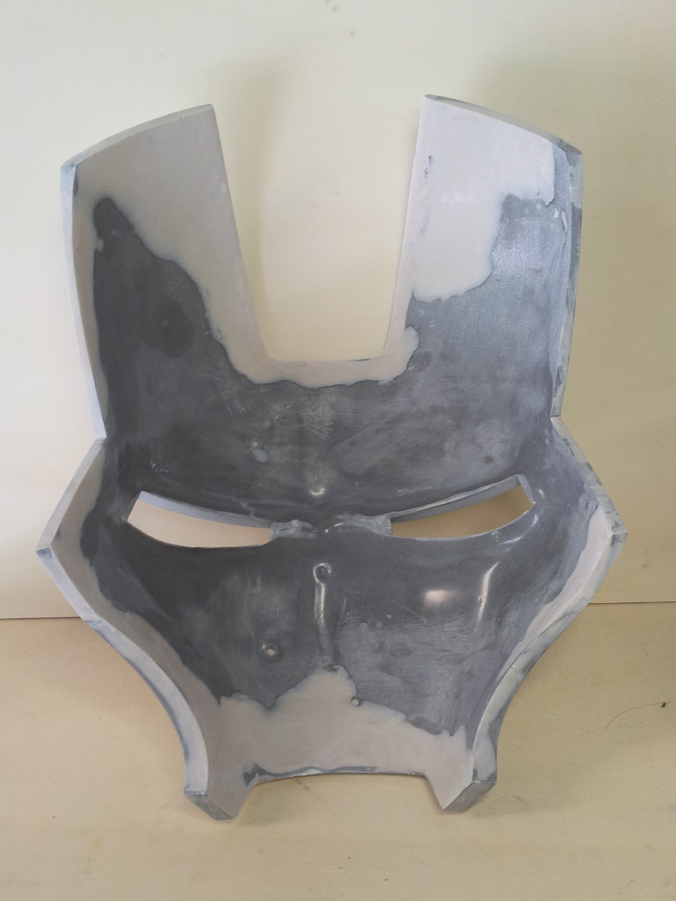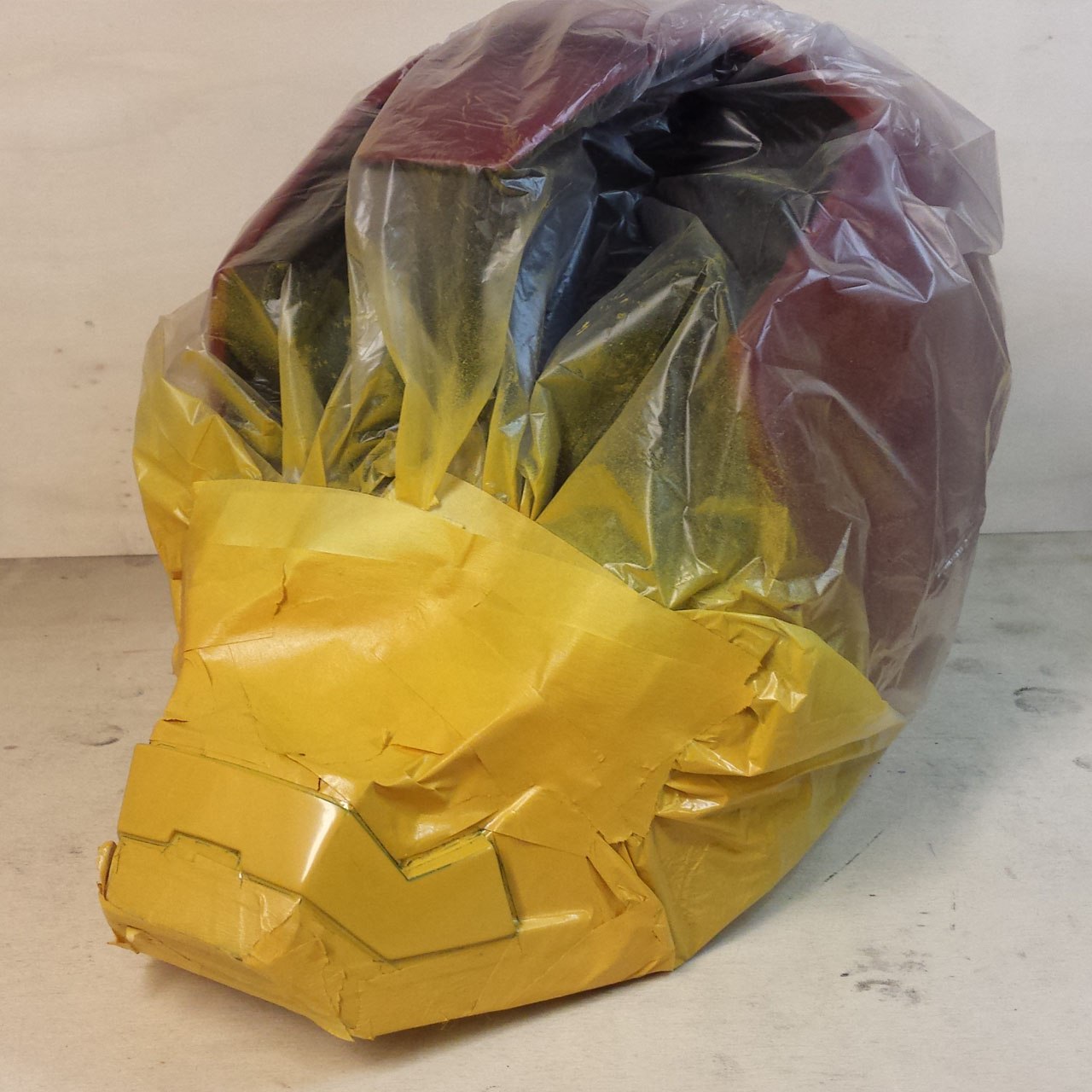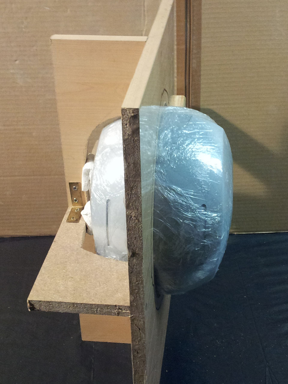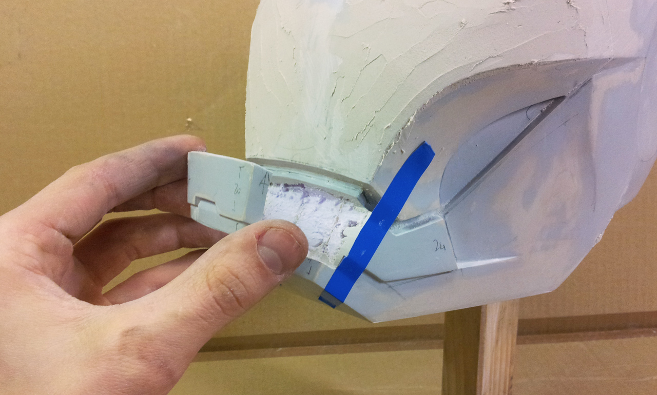 Das Urmodell wird in einer zweiteiligen Silikonform abgeformt. Hierfür muss zuerst ein Untergestell aus Holz gebaut werden, in der sich die Hälfte des Helms versenken lässt. Anschließend wird mit Ton eine ca. 1-2cm dicke Schicht auf den mit Frischhaltefolie umwickelten Helm aufgetragen. In dieses Volumen wird später das Silikon gefüllt. Auf den noch feuchten Ton werden Glasfaserschichten aufgebracht und damit die äußere feste Hülle der Silikonform erstellt.