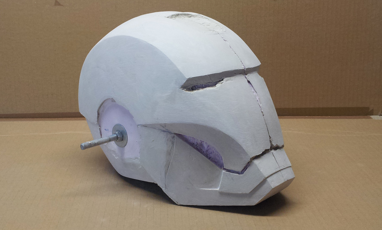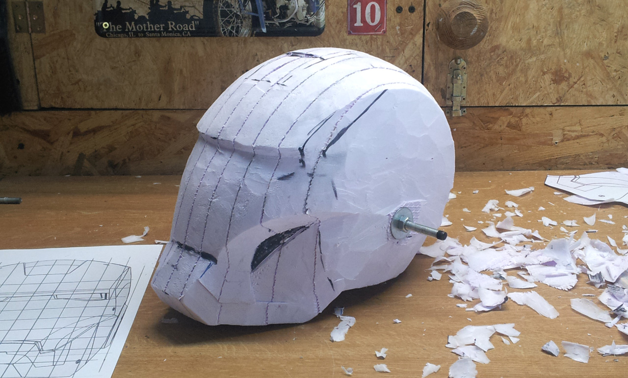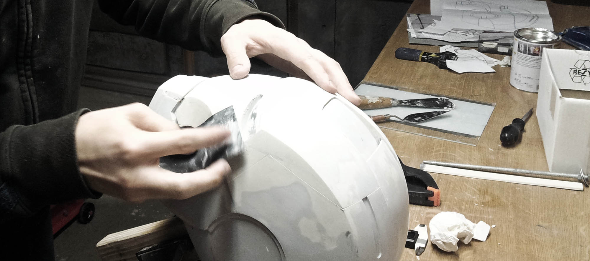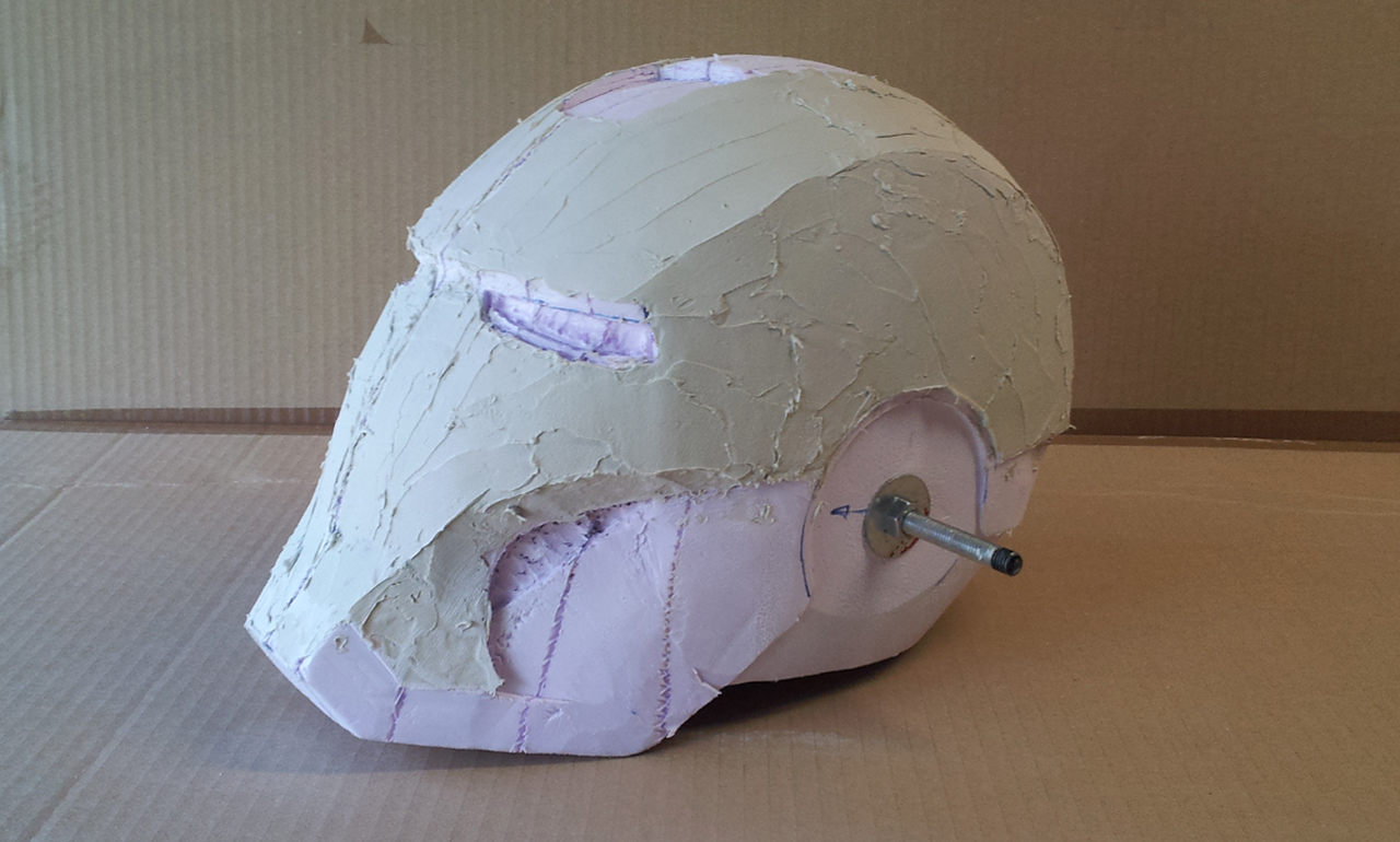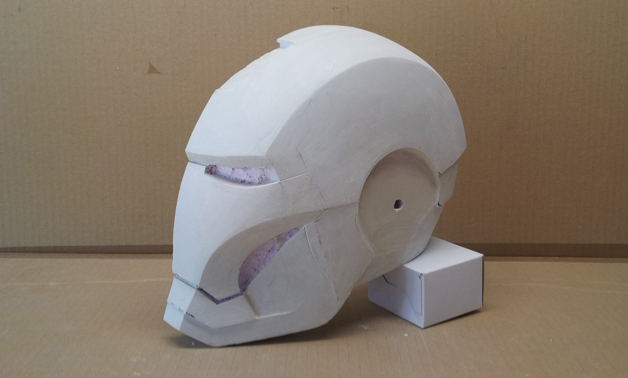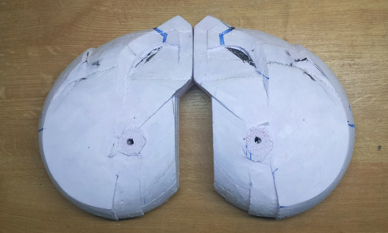 Die Basis bilden 2cm dicke Schaumplatten, die einfach geschnitten und in Form gebracht werden können. Für die Symmetrie lasse ich den Helm in zwei Hälften, sodass ich beide Teile zu jeder Zeit nebeneinander legen und vergleichen kann. Erst später werden die Teile miteinander verbunden.