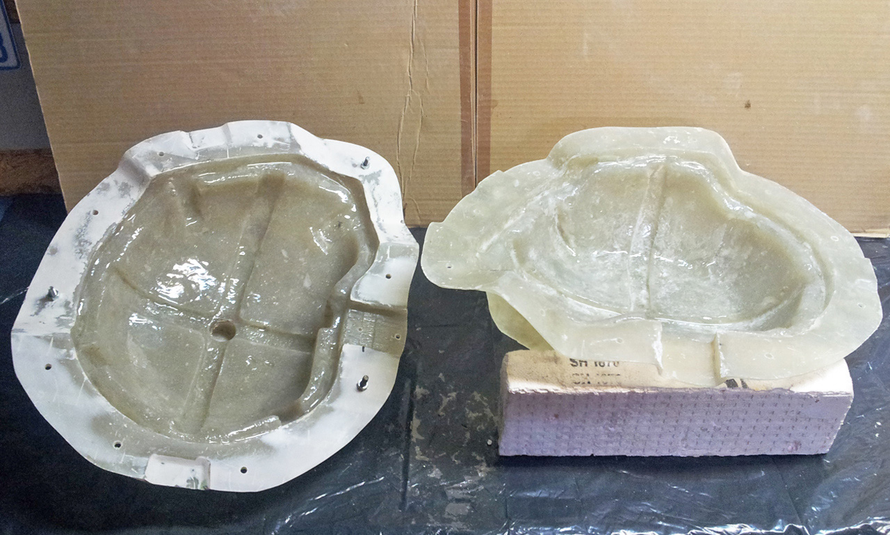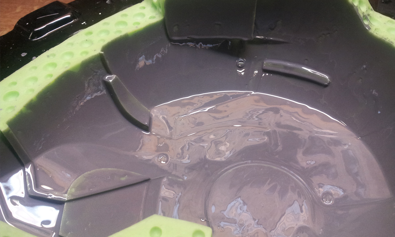 Das Abgießen erfolgt mir 2K-Polyurethan-Gießharz, das zuerst in dünne Schichten von innen in die Negativform gepinselt wird. Anschließend werden auf das noch feuchte Harz Glasfaserschnipsel gestreut. Für bessere Steifigkeit experimentierte ich auch mit Glasfasermatten.