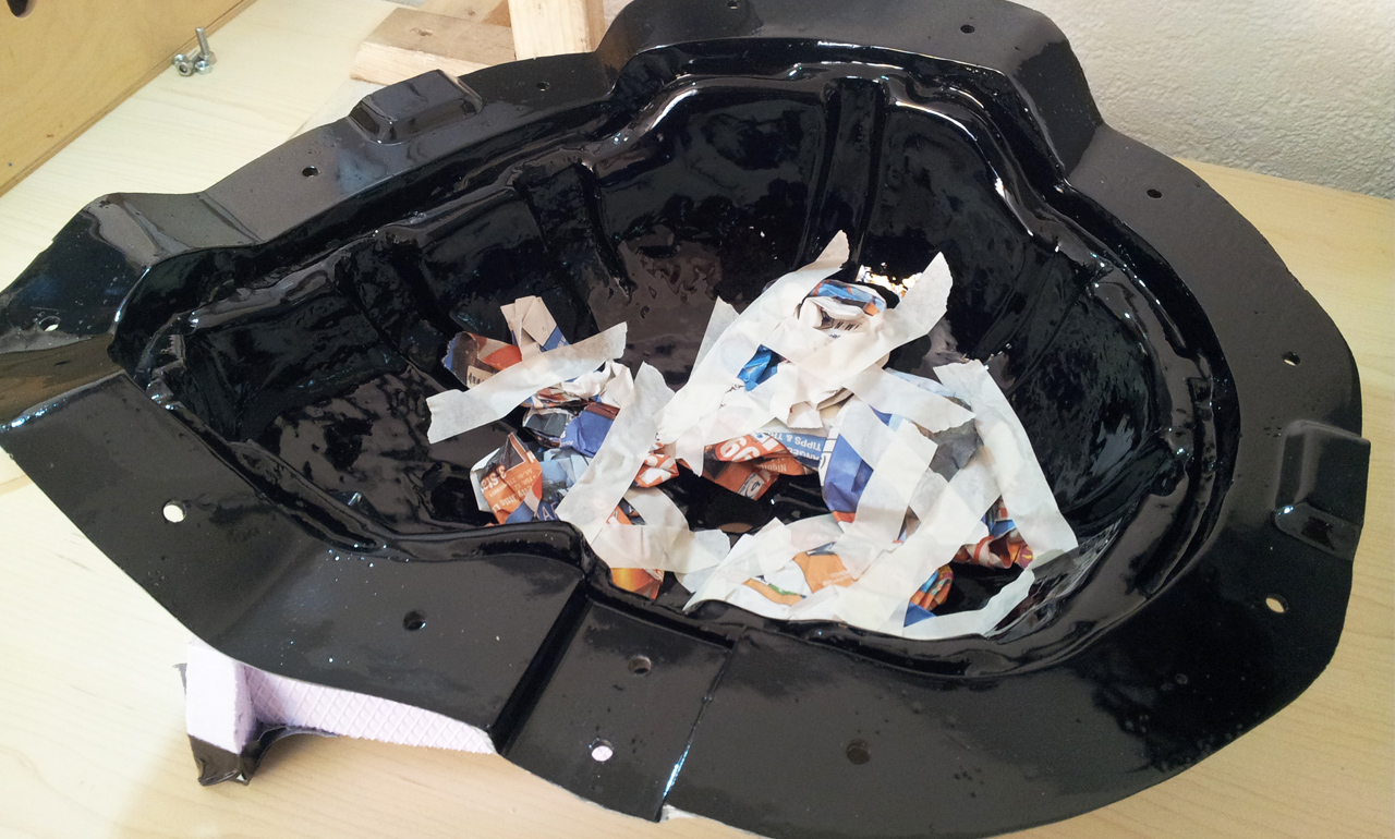 Die Innenseite wird schwarz lackiert und nach dem Trocknen abgeklebt, damit kein Sprühnebel in den Innenraum gelangen kann. Eine gelbe Deckschicht dient als Untergrund für den goldenen Metalliclack.