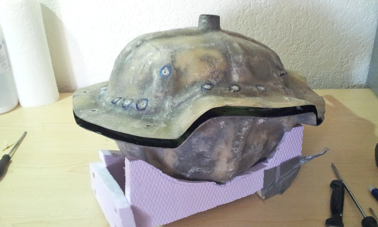 Nach dem Aushärten des GFKs wird die Schale abgenommen und der Ton entfernt. Nun wird der Helm in die schon fertige Schale gebettet und die Ränder streicht man mit Trennmittel ein. Wieder nutze ich den günstigen Ton zum Auftragen einer Zwischenschicht, um anschließend die zweite Glasfaserschale zu erstellen. Danach werden die Schalen voneinander getrennt und von überschüssigen Material befreit. An manchen Stellen mit dünner Wandstärke musste ich von Außen nachbessern.