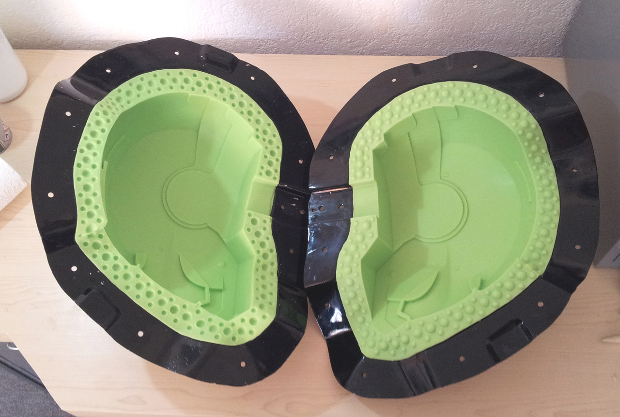 Nach dem Trocknen wird die gesamte Form umgedreht und die rechte Schale, in der sich kein Silikon befindet, abgeschraubt. Das Plastilin wird entfernt, der Helm sauber gemacht und die Kante des Silikons mit Trennmittel eingestrichen.