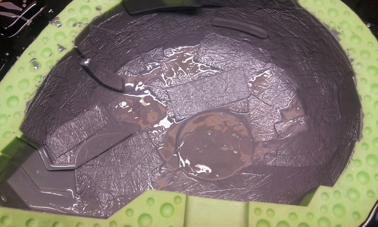 Das Silikon wird in zwei Schritten aufgebracht. Zuerst werden die Details per Hand mit Silikon bestrichen, damit keine Luftblasen in den Ecken und Kanten hängen bleiben. Erst danach wird die Schale aufgeschraubt und der restliche Hohlraum mit Silikon aufgefüllt.