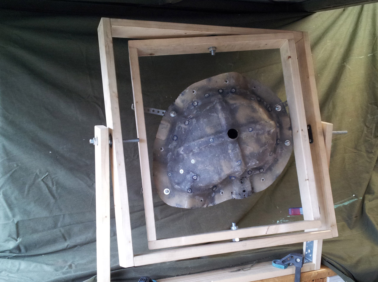 Nachdem die innere Schicht aufgetragen ist, werden die Hälften miteinander verschraubt und in ein Rotiergestell eingespannt. Hier wird eine kleine Menge eingefülltes Gießharz so lange an den Wänden verteilt, bis sich eine gleichmäßige Schicht ergeben hat.