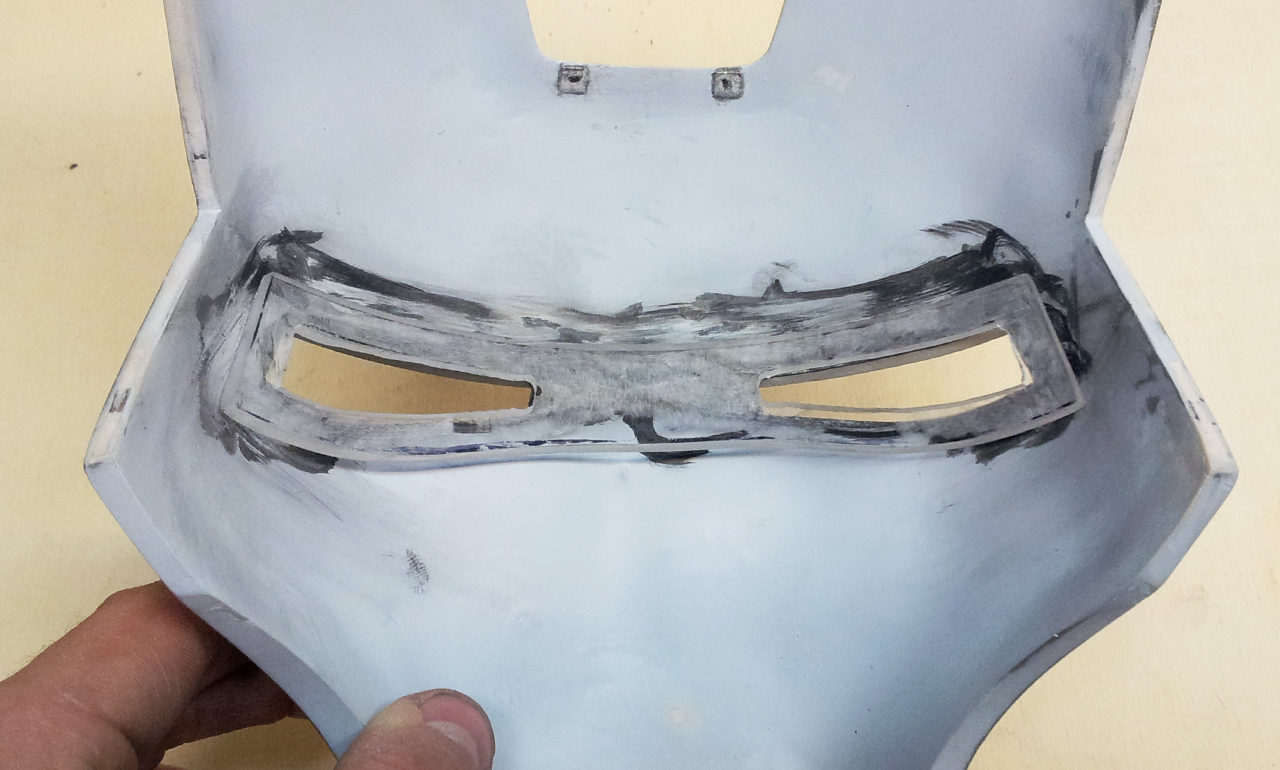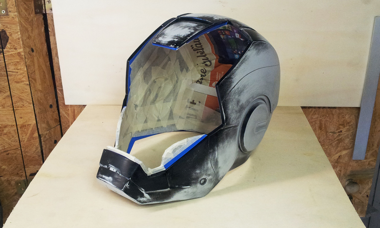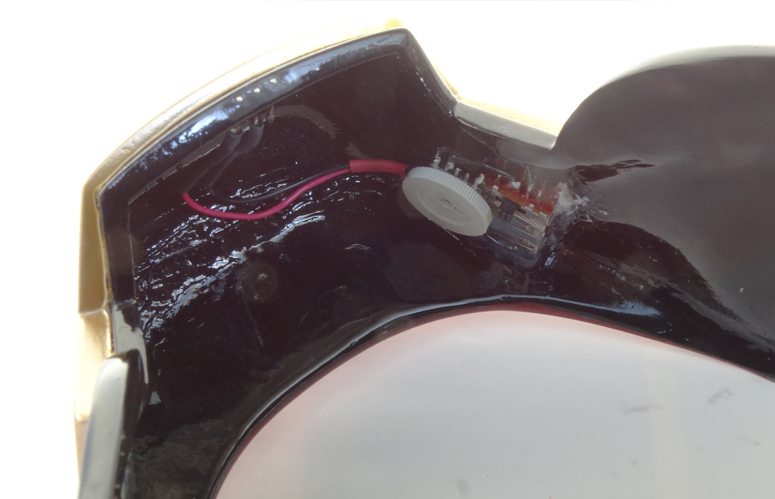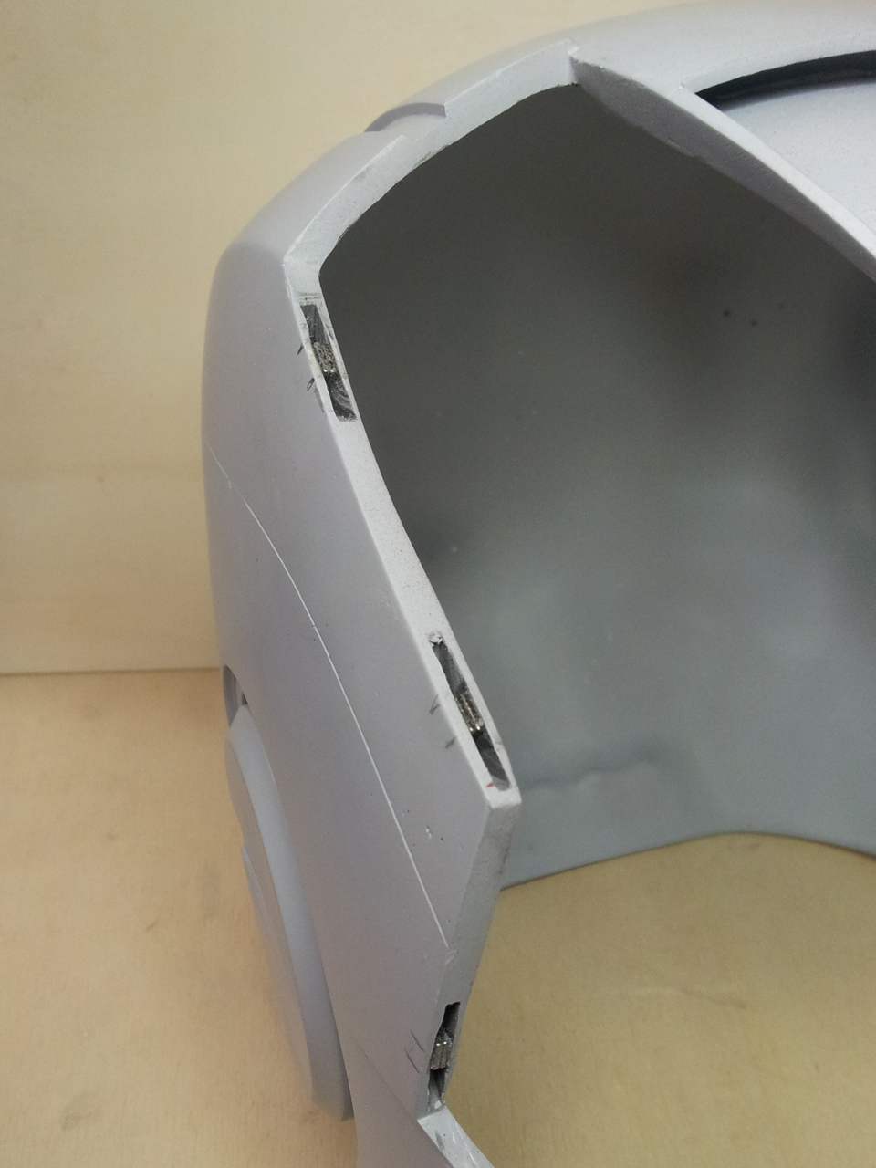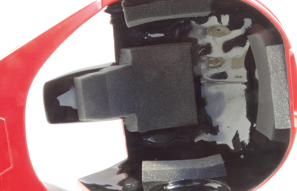 Als letztes werden innen noch Schaumstoffpolster angeklebt, damit der Helm ordentlich sitzt. Die Stromzufuhr zur Faceplate wird über einen USB Eingang mit Dimmregler realisiert, der über Kontakte den Strom zur Faceplate weitergibt.
