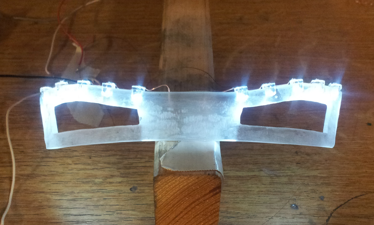Beleuchtete Augen, durch die man trotzdem schauen kann, realisiere ich mit einem gebogenen und geschnittenen Plexiglas-Streifen, der von unten beleuchtet wird und innen mit Metallgitter abgeschirmt wird.